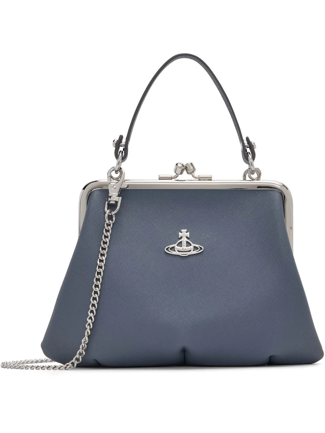 Saffiano faux-leather top handle bag. · Detachable carry handle · Detachable curb chain shoulder strap · Logo hardware at face · Darts at base · Kiss-lock closure · Zip pocket at interior · Twill lining · H5.5" x W8.75" x D2.75" Supplier color: Denim blue Synthetic. Made in Italy 252314F046014