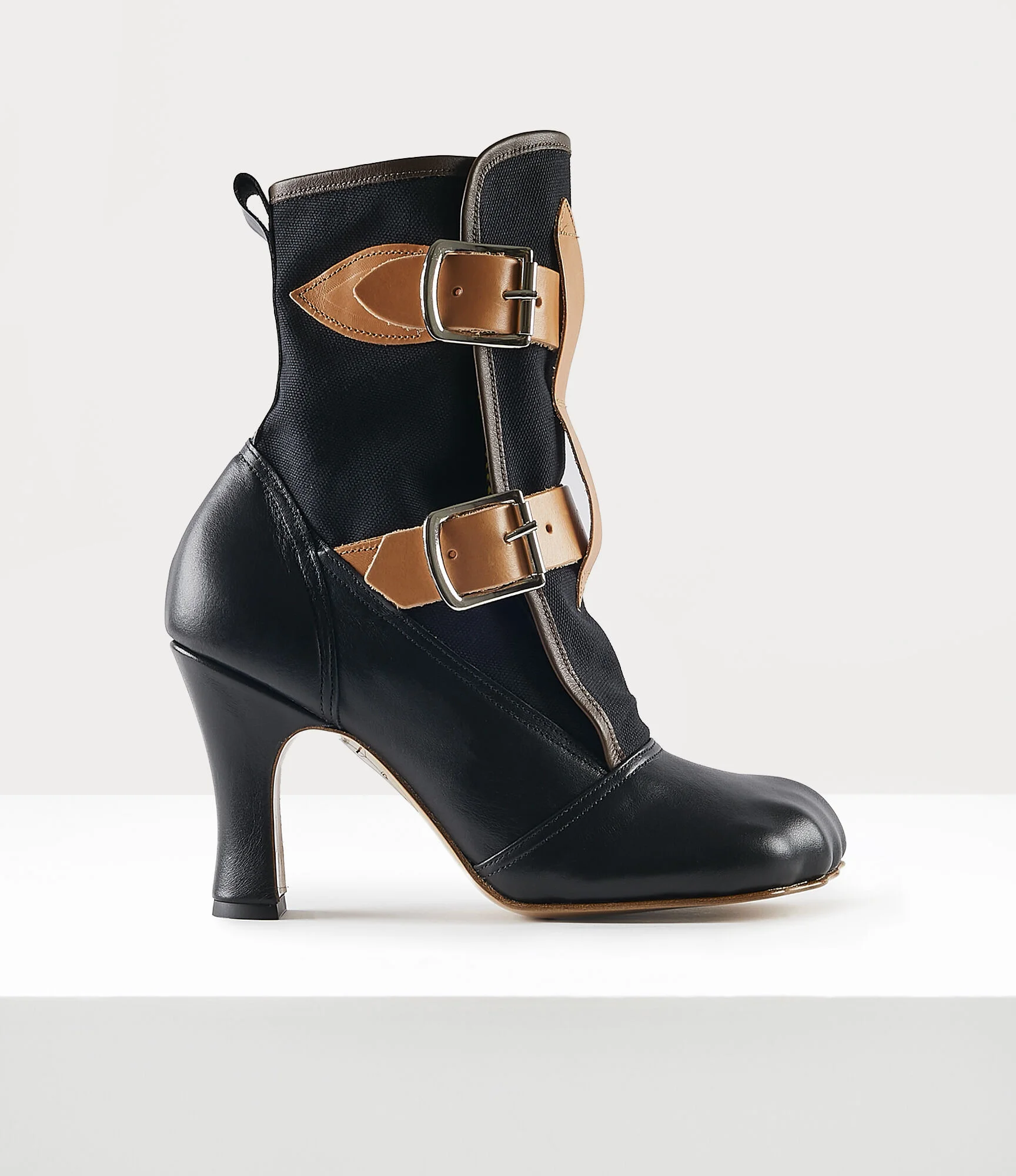First created for Vivienne's Spring-Summer 2002 'Nymphs' collection, the Bondage boots are highlighted with black canvas. Code: 71010061-11010-AM-BLACK - 'Animal toe' silhouette - Buckled straps - Concealed lace up fastening - Heel height: 10cm COMPOSITION - Main composition: 100% leather - Secondary composition: canvas