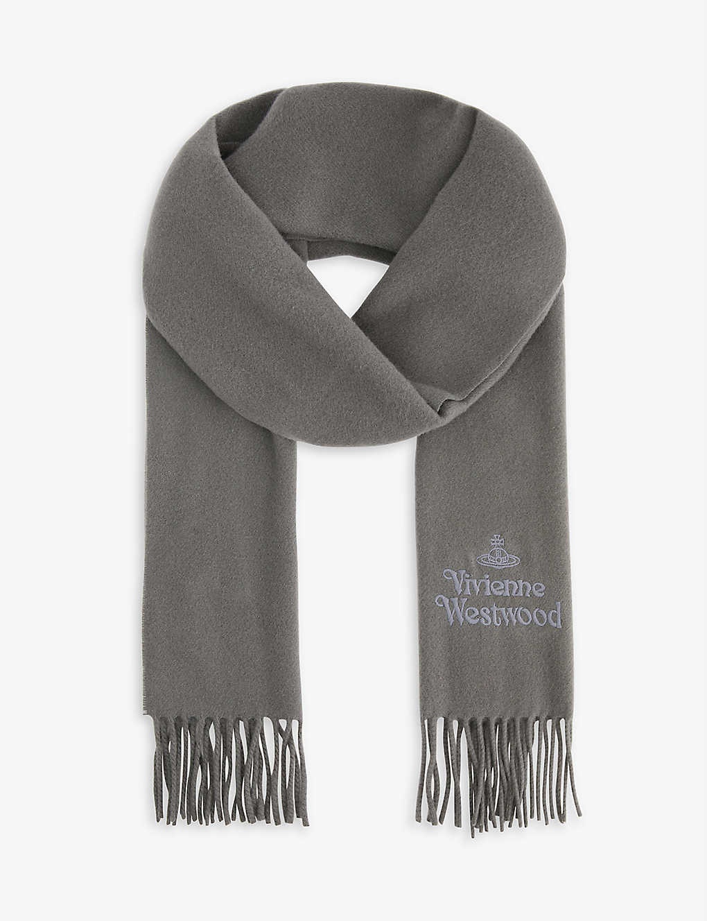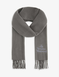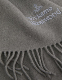 PRODUCT DETAILS - Vivienne Westwood wool scarf - 100% wool - Self-tie fastening - Rectangular shape, brand embroidery at side, fringed edges, brand tab at back - Length: 180 cm - Width: 30 cm - Dry clean only - Made in Italy - Heavyweight, stretchy