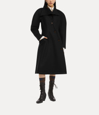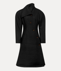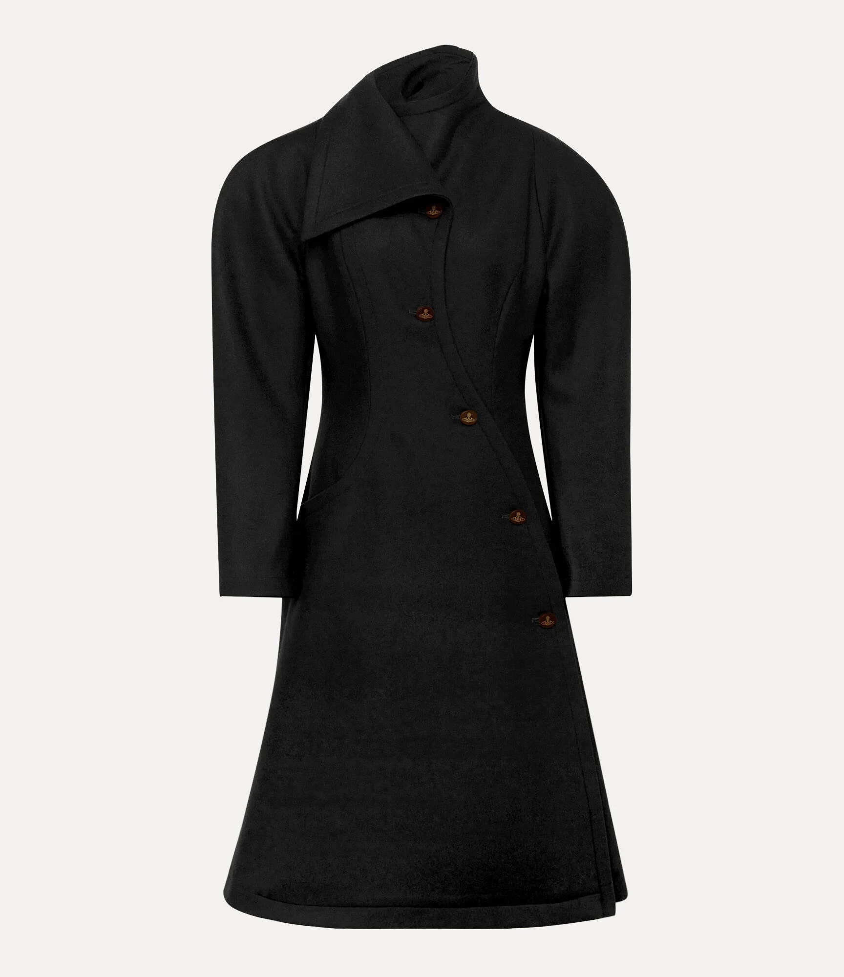 The Breeze coat features an asymmetrical single-breasted front, fastened with oval-shaped buttons engraved with the delicate 'Line Orb' motif - a nod to Vivienne’s vision of blending tradition with the future. Crafted from a wool-cashmere blend, the coat includes exaggerated rounded shoulders, a sharply contoured waist, and a flared hem, creating a tailored silhouette. Code: 1301002E-W019Z--BLACK - Features an asymmetrical, tailored fit - Oval-shaped buttons - Oversized shoulders - Cinched waist - Side pockets - Midi-length silhouette - Lightweight wool - Curved panel details - Tonal stitching - Model is 5'11/180cm and is wearing a size 40 - Made in Italy COMPOSITION - 95% Virgin wool - 5% Cashmere