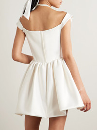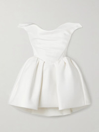Vivienne Westwood often looks to the archives for inspiration - for instance, this mini version of the 'Bagatelle' dress is inspired by one from the Spring '97 collection. A romantic choice for your reception or bridal shower, it's been handmade in England from duchesse silk-satin and has a structured, corset-style bodice with a draped off-the-shoulder neckline and voluminous pleated skirt. Size & Fit - Fits true to size, take your normal size - Designed to be fitted at the bust and waist, loose at the hip - Internal bodice for support - Mid-weight, structured, non-stretchy fabric - Model is 175cm/ 5'9" and is wearing a UK 8 Model measurements: - Bust: 81cm/ 31.75" - Waist: 63cm/ 24.75" - Hip: 91cm/ 36" Details & Care - Ivory duchesse silk-satin - Concealed hook and zip fastening at back - 100% silk - Dry clean - Designer color: Pearl
