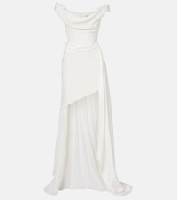 Designed, sampled, and hand-crafted in England, Vivienne Westwood's bridal collection is for the most memorable moments. The Comet minidress is made from pure silk and flaunts an off-shoulder silhouette with an asymmetric hemline and a glamorous back train. Product Details - Material: 100% silk - Care instructions: dry clean - Made in the UK - Designer color name: Opaline - Item color: white - Lining: 100% silk - Closure: concealed zipped back - Built-in bustier - Boning - Hem: uneven - Includes: garment bag - Item number: P01104640 Size & Fit - Fits small to size - we recommend trying one size larger - Off-the-shoulder - Internal boned corset for support - Cinched waist - Non-stretchy fabric - The model seen in the picture is 178cm-5'10" and wearing a size UK 10