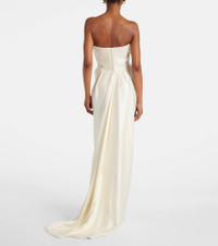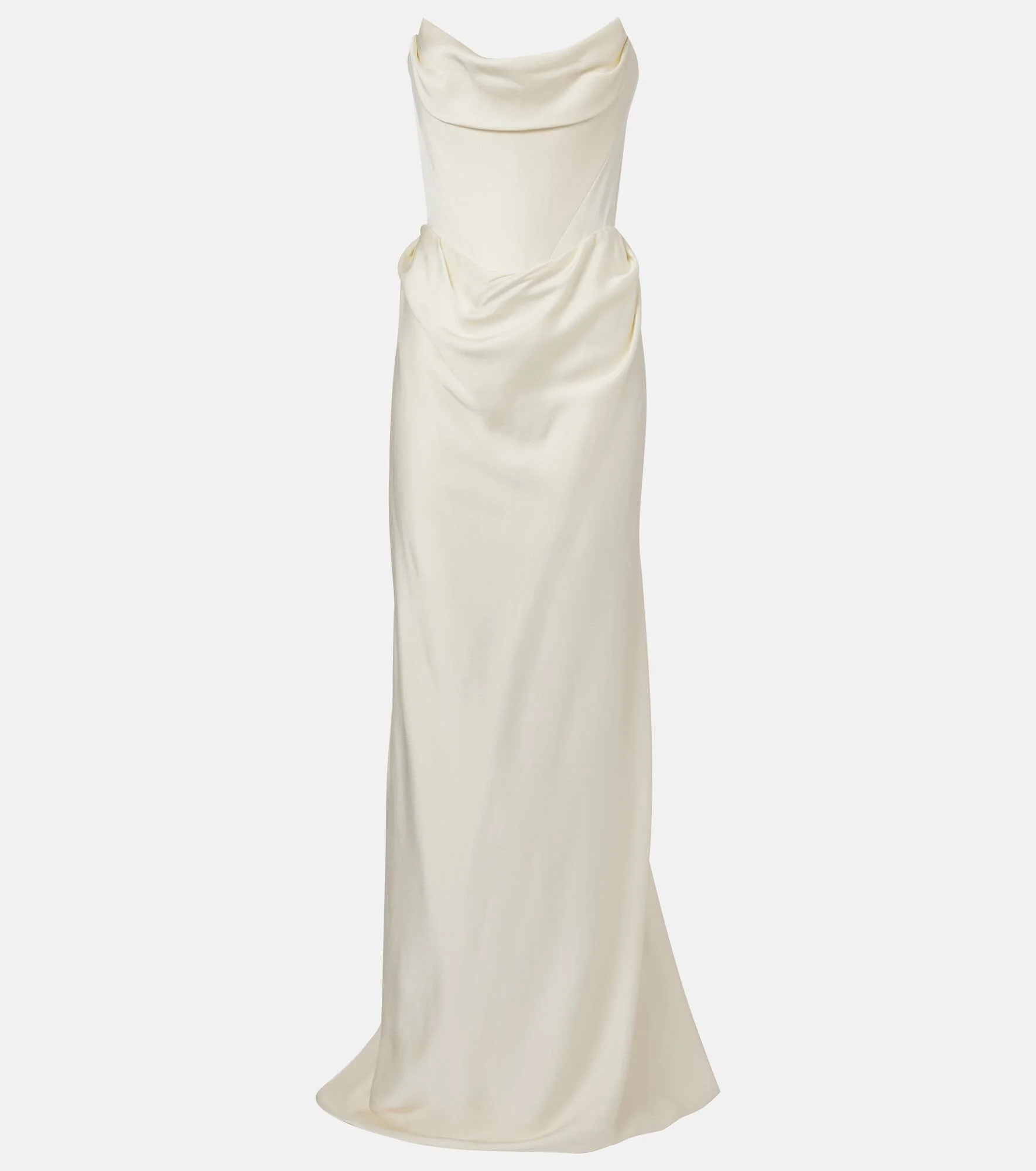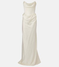 Transforming the constrictive Victorian undergarment into a symbol of empowerment, Vivienne Westwood’s corsetry remains unparalleled. The bridal Galaxy gown is made from heavy crepe satin, has an off-shoulder neckline, and falls to a floor-length silhouette. Product Details - Material: 73% acetate, 27% viscose - Care instructions: dry clean - Made in the UK - Designer color name: Cream - Item color: ivory - Lining: 100% viscose - Item number: P01048002 Size & Fit - True to size - Strapless - Internal boned corset for support - Cinched waist - Non-stretchy fabric - slit length 57cm-22.5" - The model seen in the picture is 178cm-5'10" and wearing a size UK 8
