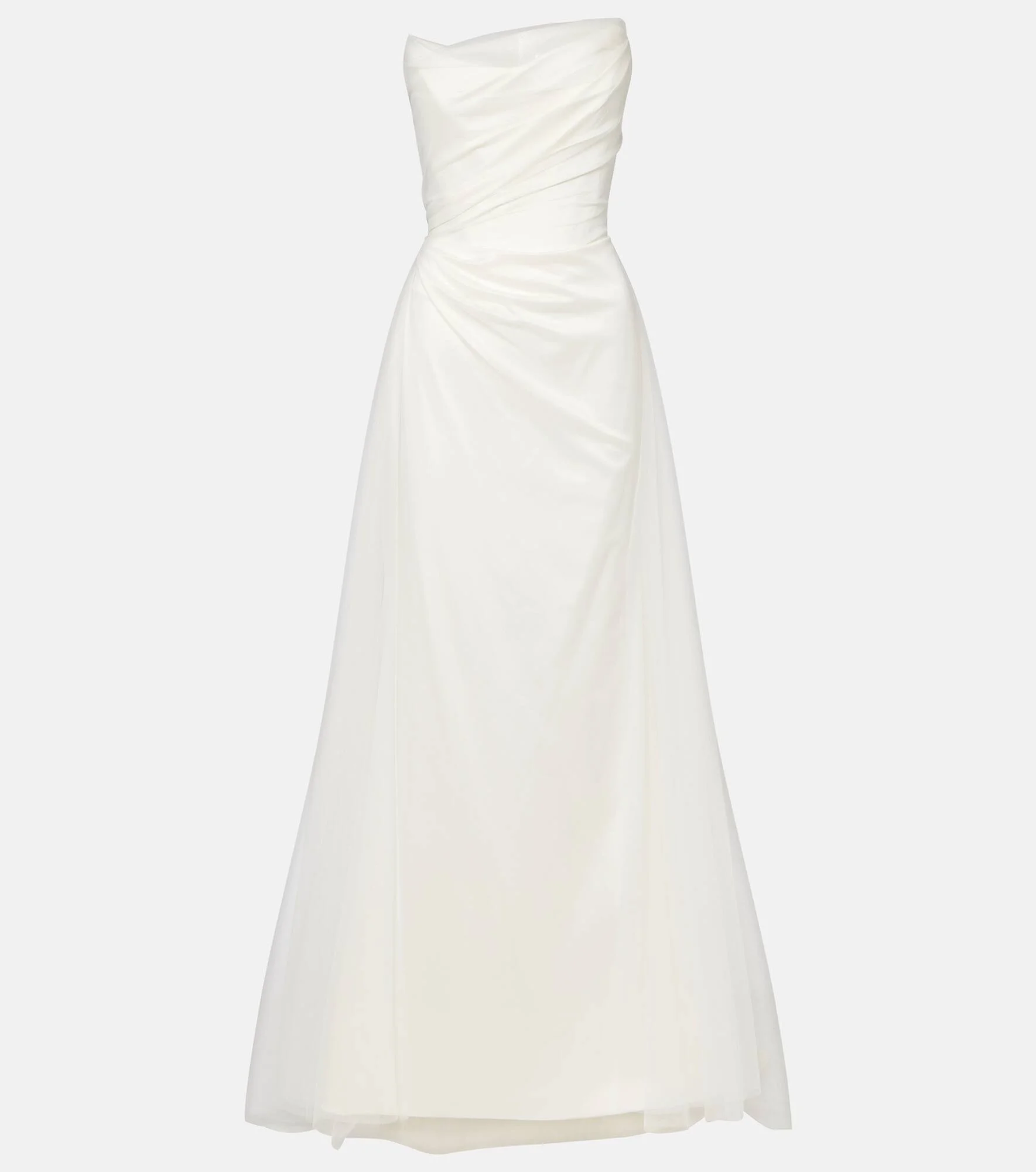 Product Details - Material: 57% acetate, 37% polyamide, 6% elastane - Care instructions: specialist clean - Made in the UK - Designer color name: Ivory - Closure: zip and hook fastening, bearer button - Built-in bustier - Comes with garment bag - Item number: P01001297 Size & Fit - True to size - Strapless - Internal boned corset for support - Cinched waist - Non-stretchy fabric - The model seen in the picture is 178cm-5'10" and wearing a size UK 8