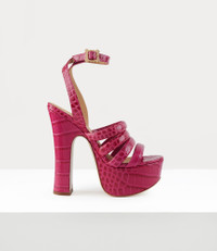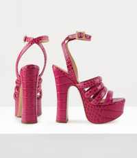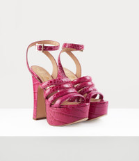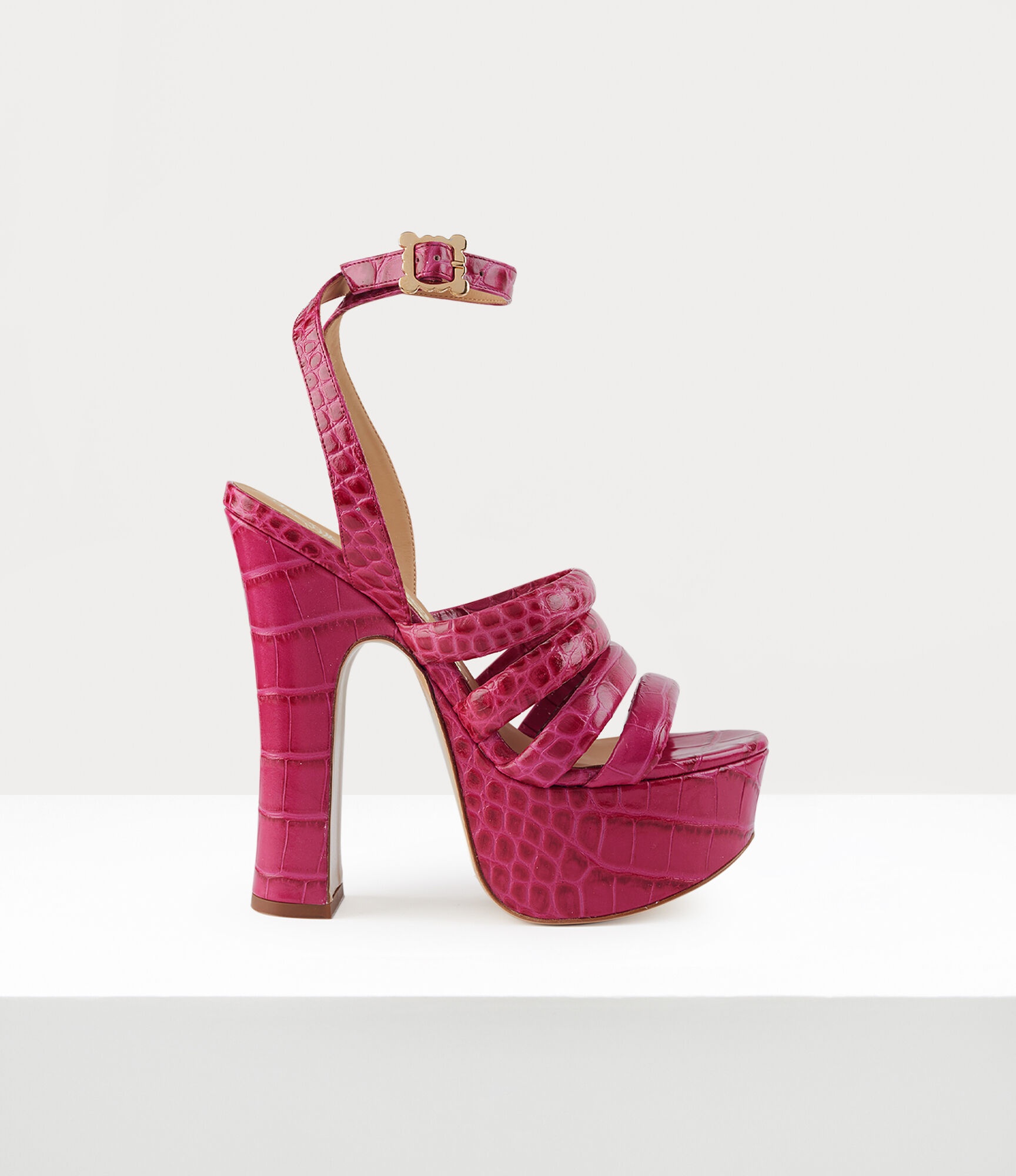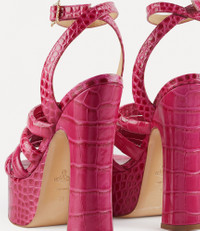 Made in Italy, the new Britney platforms in pink croc-effect leather wrap-around straps that fasten with mini frame buckles. Artisanal leather outsole Gold-tone plating Embossed insole Multiple straps Open toe Block heel Measurements: 14.5cm heel with a 5cm platform Code: 74050016WL0039G406 Details & Features To clean, simply wipe gently with a dry soft cloth. Do not allow your product to get wet or damp. Store in the provided dust bag or gift box, in a dry and well-ventilated place.