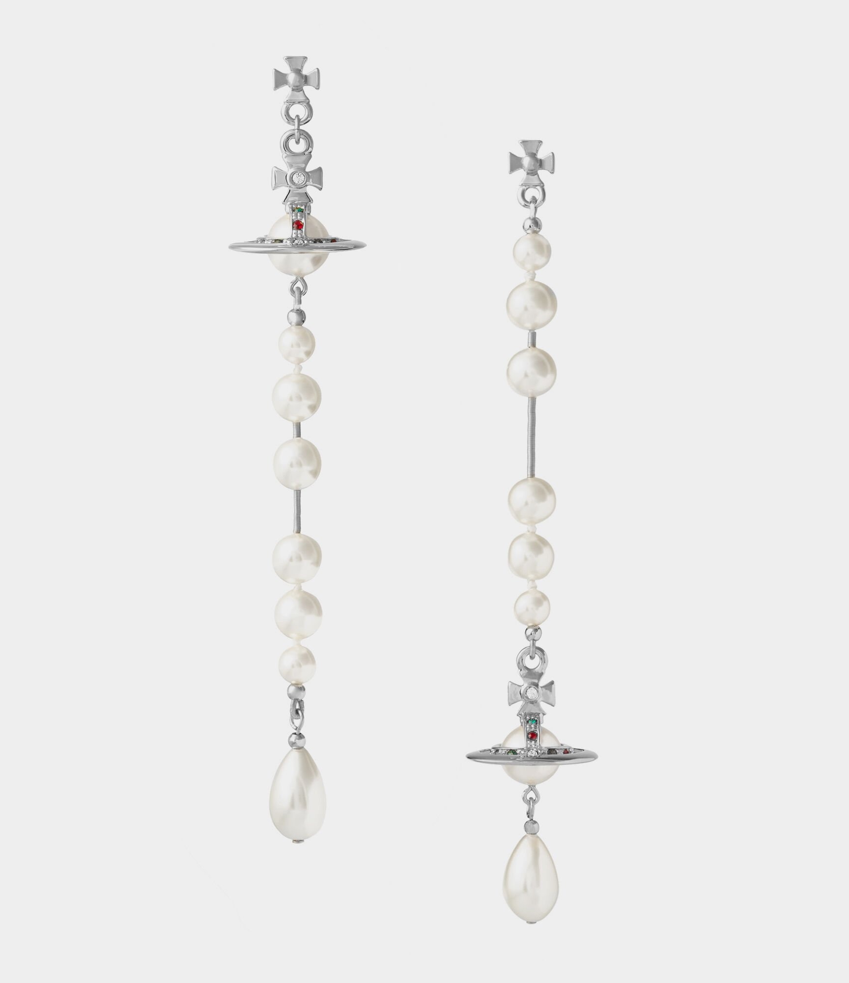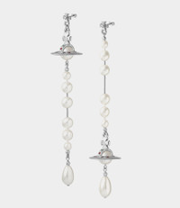 The Broken Pearl earrings are characterised by their ‘broken’ effect design and feature our orb motif. Made from silver-toned brass, they are decorated with glass-based pearls and multicoloured Swarovski crystals. Please note that we do not accept returns on earrings. Material 100% Brass Code: 6203000202P128P128 Details & Features Orb dimensions: H 2.5cm x W 2.2cm Drop length: 9cm
