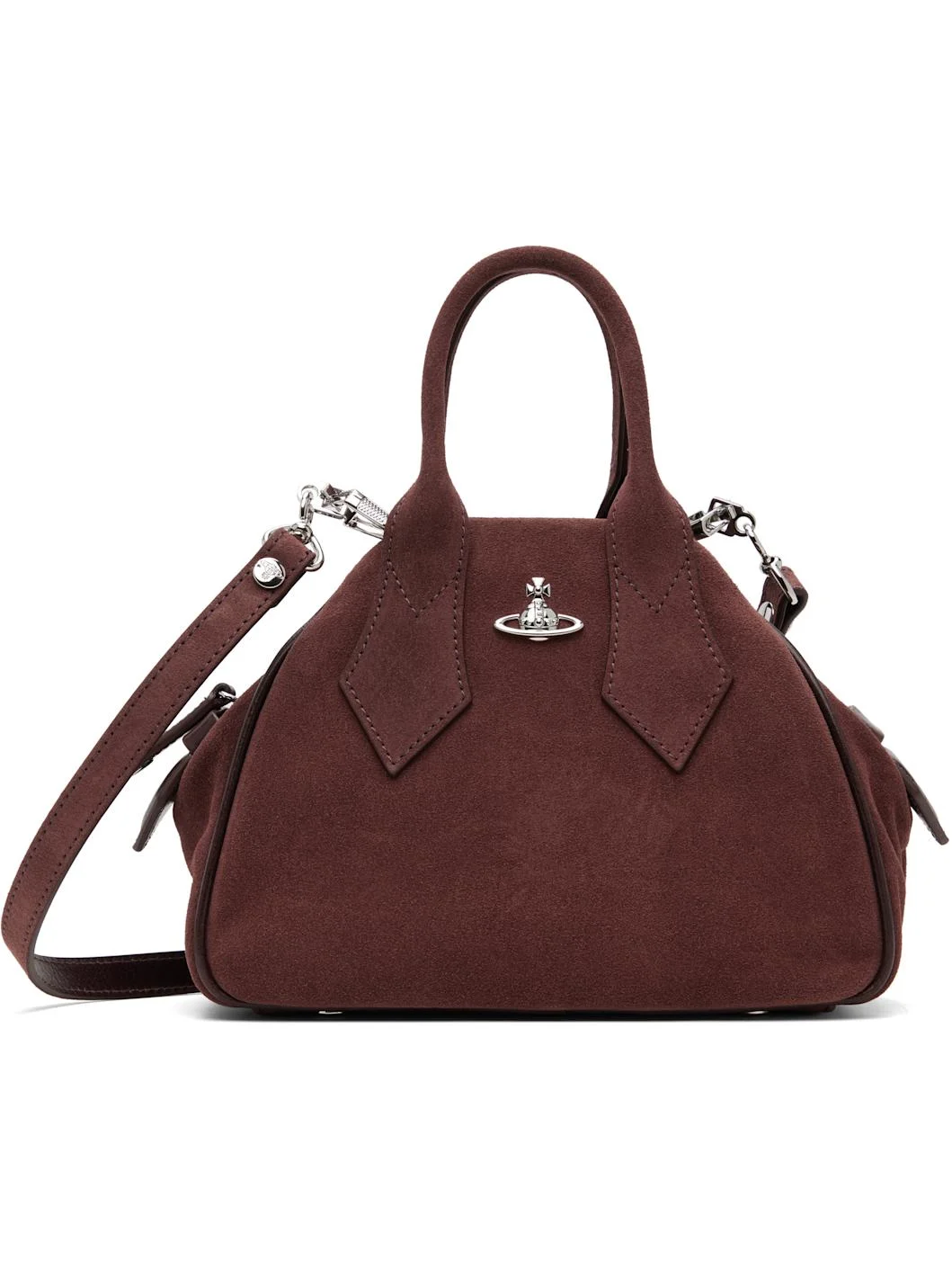 Calfskin suede top handle bag. · Twin rolled carry handles · Adjustable and detachable shoulder strap · Logo hardware at face · Press-stud tab at sides · Bumper studs at base · Zip closure · Zip and patch pocket at interior · Canvas lining · Logo-engraved silver-tone hardware · H6" x W9" x D4" Supplier color: Chocolate brown Calfskin. Made in Italy 252314F046042
