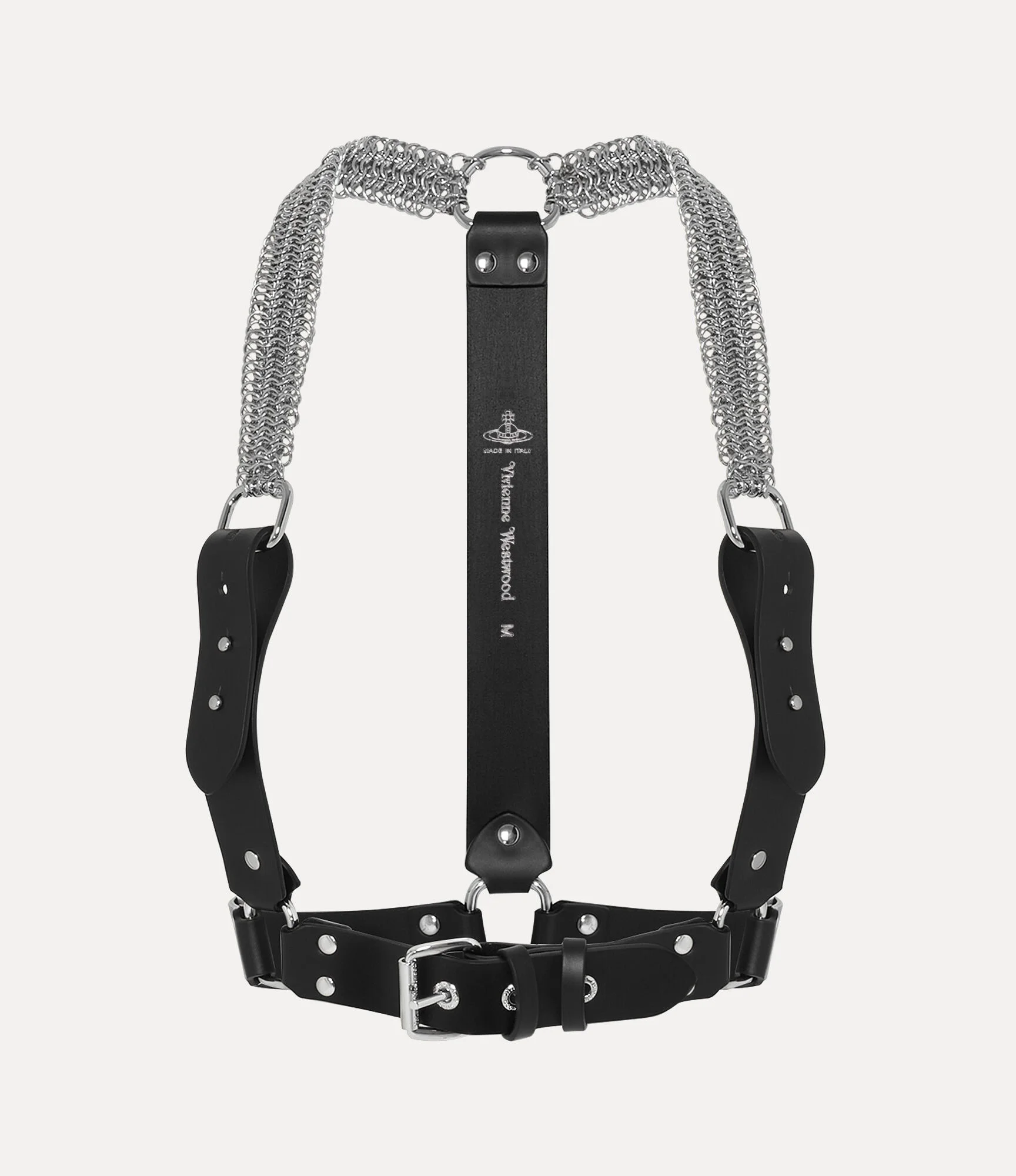Our Chain Leather harness features panels of polished silver-tone chainmail influenced by ancient armour, traditionally designed to drape the body for protection. Finished with bondage-inspired elements, the style pairs smooth leather straps with hoop detailing, completed with the house’s classic roller-buckle fastening. Code: 82110004U-C006L--SILVER - Features hoop and stud detailing - Polished silver chainmail - Roller buckle fastening - Polished hardware - Smooth leather - Stud details - S - waist 71.5cm, shoulder to waist 53 cm - M - waist 79 cm, shoulder to waist 55 cm - L - waist 96 cm, shoulder to waist 55 cm - Made in Italy COMPOSITION - Main material: 100% cow leather - Hardware: 100% stainless steel