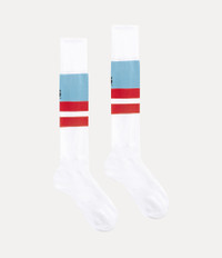 Our socks feature a bold intarsia “CHAOS” slogan woven across the upper panel of the design, complete with double stripe detailing at the mid-leg. The piece offers the house's signature multi-coloured orb embroidery, recalling Vivienne's vision of launching tradition into the future. Code: 8104000I-K0060--WHITE - Features a soft, breathable design - Knee-high length - Ribbed cuff for a secure fit - Embroidered orb motif - Contrasting colour-block design - Reinforced heel and toe - Stretch construction - Unisex design - Chaos jacquard - Worlds End - Made in Italy COMPOSITION - 100% Cotton