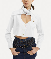 The Cut-off Heart shirt originated from an archive design of the Heart shirt, which employs Vivienne’s original heart tailoring system – where the garment receives a cut-out detail at the neckline and a raised collar with an exaggerated length. Code: 1501005U-W009Q--WHITE - Cropped silhouette - Long sleeves - Step-hem - Button-front design - Multicoloured orb embroidery - Fits true to size COMPOSITION - 100% Cotton