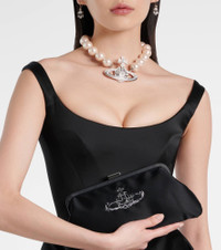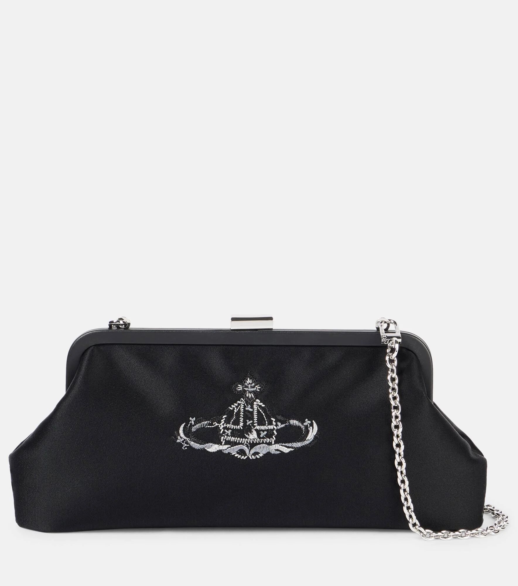 Combining Saturn's rings and the Sovereign's Orb, Vivienne Westwood's logo symbolizes carrying tradition into the future. The Dorothy clutch is crafted from luxurious black satin and features a chain shoulder strap. Product Details - Material: fabric - Lining: fabric - Made in China - Designer color name: Ultra Black - Item color: black - Closure: push-lock fastening - Chain shoulder strap - Hardware color: silver - Item number: P01025796 Size & Fit - Height 13,5cm-5.5" - Max. width 28cm-11" - Max. depth 4cm-1.5" - Chain length 102cm-40"