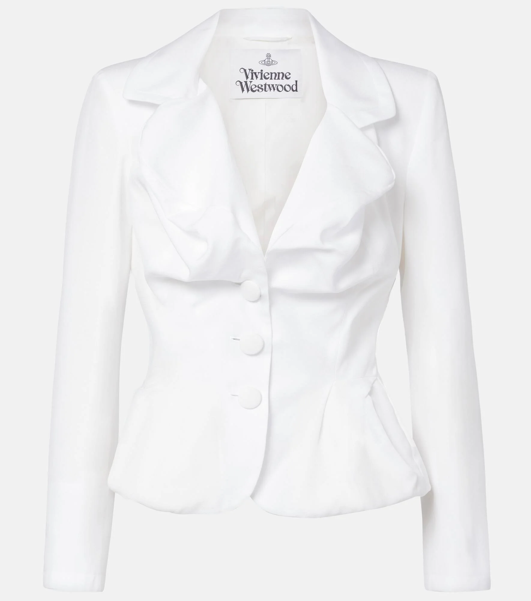 Vivienne Westwood's Drunken jacket is cut following the brand's signature tailoring pattern cutting system, resulting in a unique design that flatters the figure and challenges traditional silhouettes. The style is finished with tonal buttons and notched lapels. Product Details - Material: 100% viscose - Care instructions: dry clean - Made in Italy - Designer color name: Off White - Item color: white - Lining: 100% viscose - Closure: single-breasted (three buttons) - Cloverleaf lapel - Shoulder pads - Cuff: one button - Pockets: side slit pockets - Vent: single - Fully lined - Item number: P01074693 Size & Fit - True to size - Shoulder pad inserts - Cinched waist - Non-stretchy fabric - Falls to the hip - The model seen in the picture is 178cm-5'10" and wearing a size IT 40