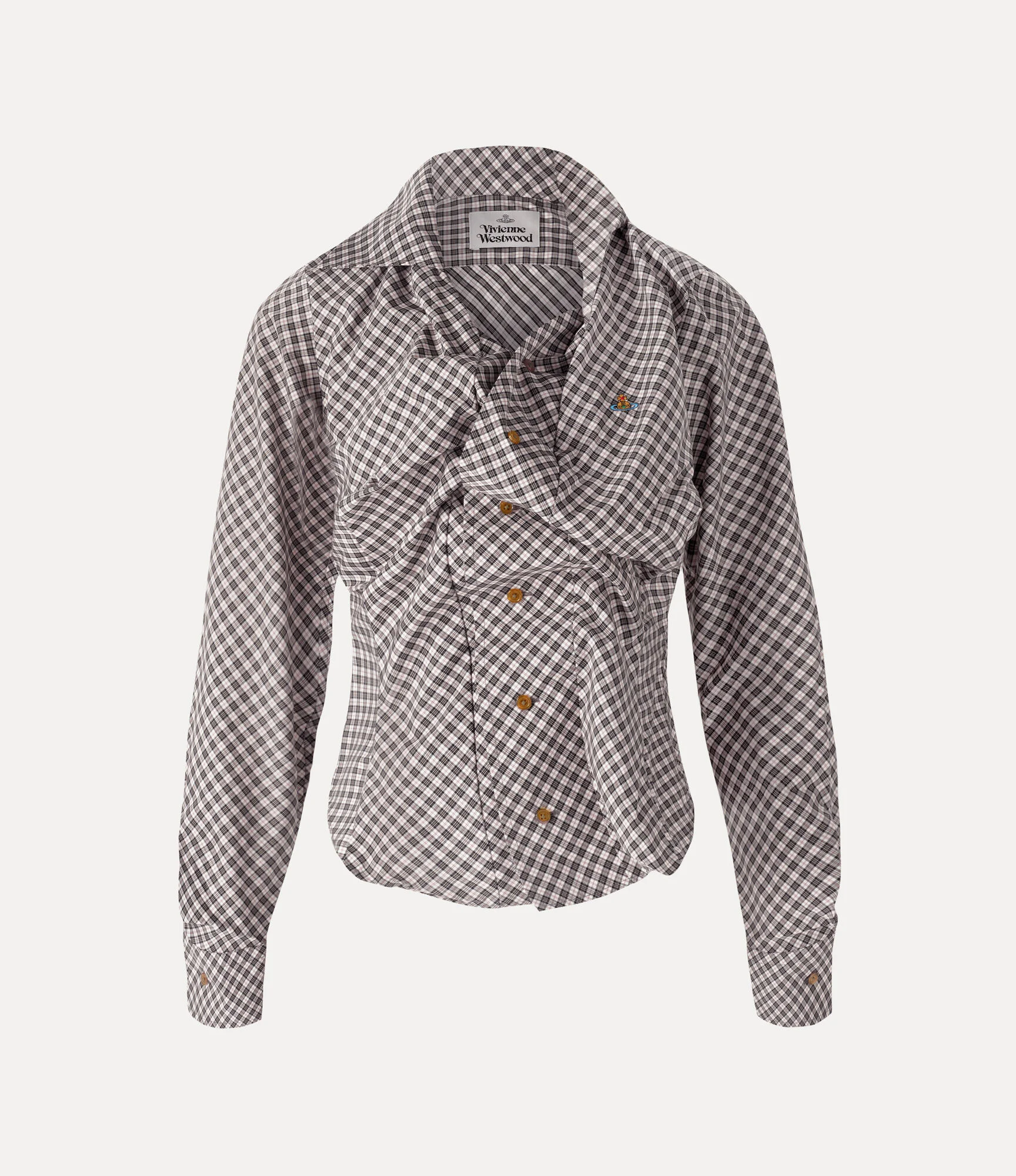 The Drunken shirt employs Vivienne’s original experimental drunken tailoring pattern cutting system – where garment elements are distorted assuming an almost surreal shape. Complete with an off-centre button placket and an asymmetric hem, the piece is adorned with this season’s muted check motif. Code: 1501000C-W0178--OFF-WHITE - Features a front- button fastening - Fits true to size - Buttoned cuffs - Orb embroidery - Darting along the front - Long sleeves - Off-centre collar - Contorted seams - Cinched-in waist COMPOSITION - 100% Organic cotton