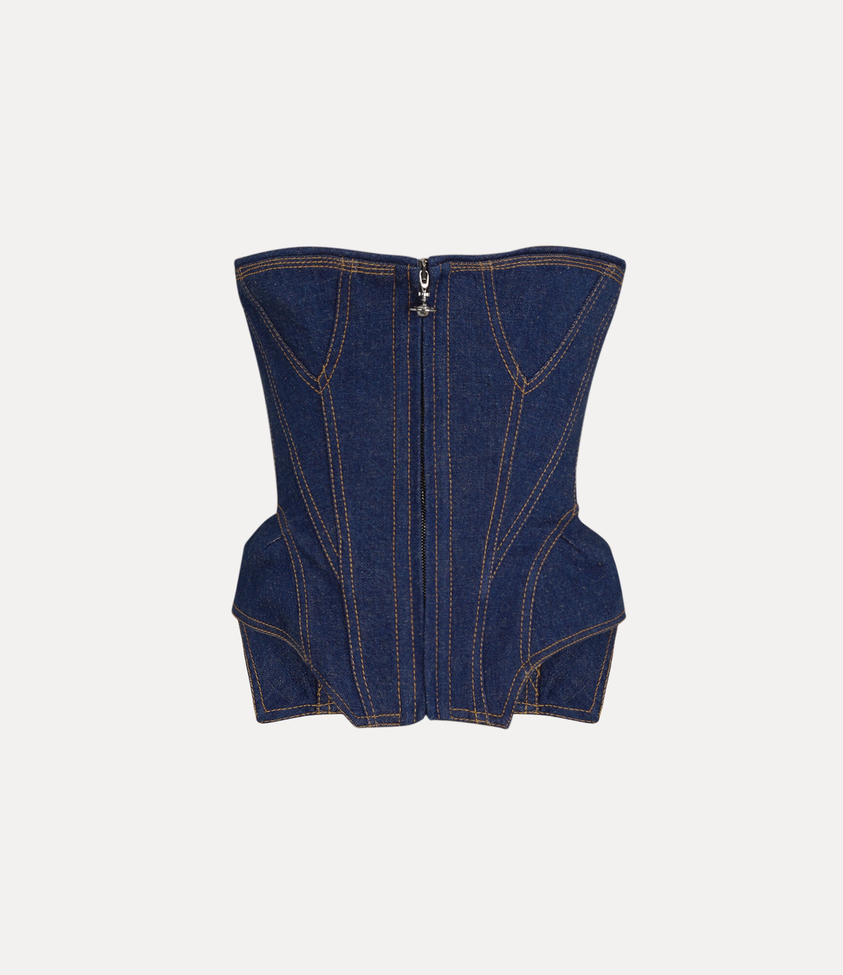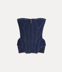 The Denim Cobrax corset is characterised by a sculpted bodice, enhanced by internal boning. Reflecting Vivienne's reinterpretation of the classic corset, a garment once worn by the high society women of eighteenth-century salon culture, the piece is offered in a soft indigo denim fabric with contrasting, tan-coloured topstitching to enhance the silhouette, featuring a lace-up closure at the back of the design, reminiscent of the house's archive corset styles. Code: 15030040-W0162--INDIGO - Features a strapless design - Straight neckline - Front zip closure - Elongated silhouette - Lace-up back - Supportive fit - Model is 5'11/180cm and is wearing a size 40 - Made in Italy COMPOSITION - 80% Cotton - 20% Linen
