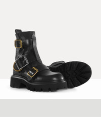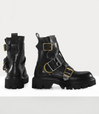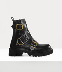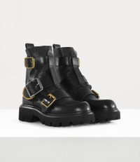 The Empire boots draw inspiration from the archival Rome boots, first introduced in the house’s Autumn-Winter 1983 collection. The design features an oiled leather finish, adorned with belted leather straps and roller-buckle details, evoking themes of restriction and control inspired by bondage and fetish wear. Code: 7101007MW-C006V--BLACK - Features an ankle-length design - Round toe - Combat-style design - Roller-buckle fastening - Mixed-metal hardware - Tonal stitching - Shiny finish - Anti-slip outsole - Made in Italy COMPOSITION - Upper: 100% vegetable tanned calf leather - Hardware: mixed-metal plated brass