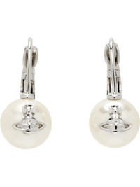 Pair of drop earrings in silver-tone brass. · Faux-pearl with logo at face · Hinged-post fastening · H1" x W0.5" Supplier color: Platinum/Creamrose Brass. Made in Thailand 252314F022019