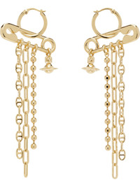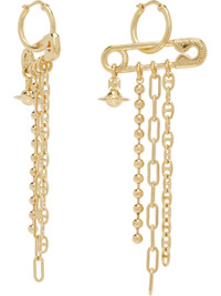 Pair of drop earrings in gold-tone brass. · Logo-engraved safety-pin charm · Logo pendant and assorted chains at drop · Hinged post fastening · H3.5" x W1.25" Supplier color: Gold Brass. Made in Thailand 252314F022010