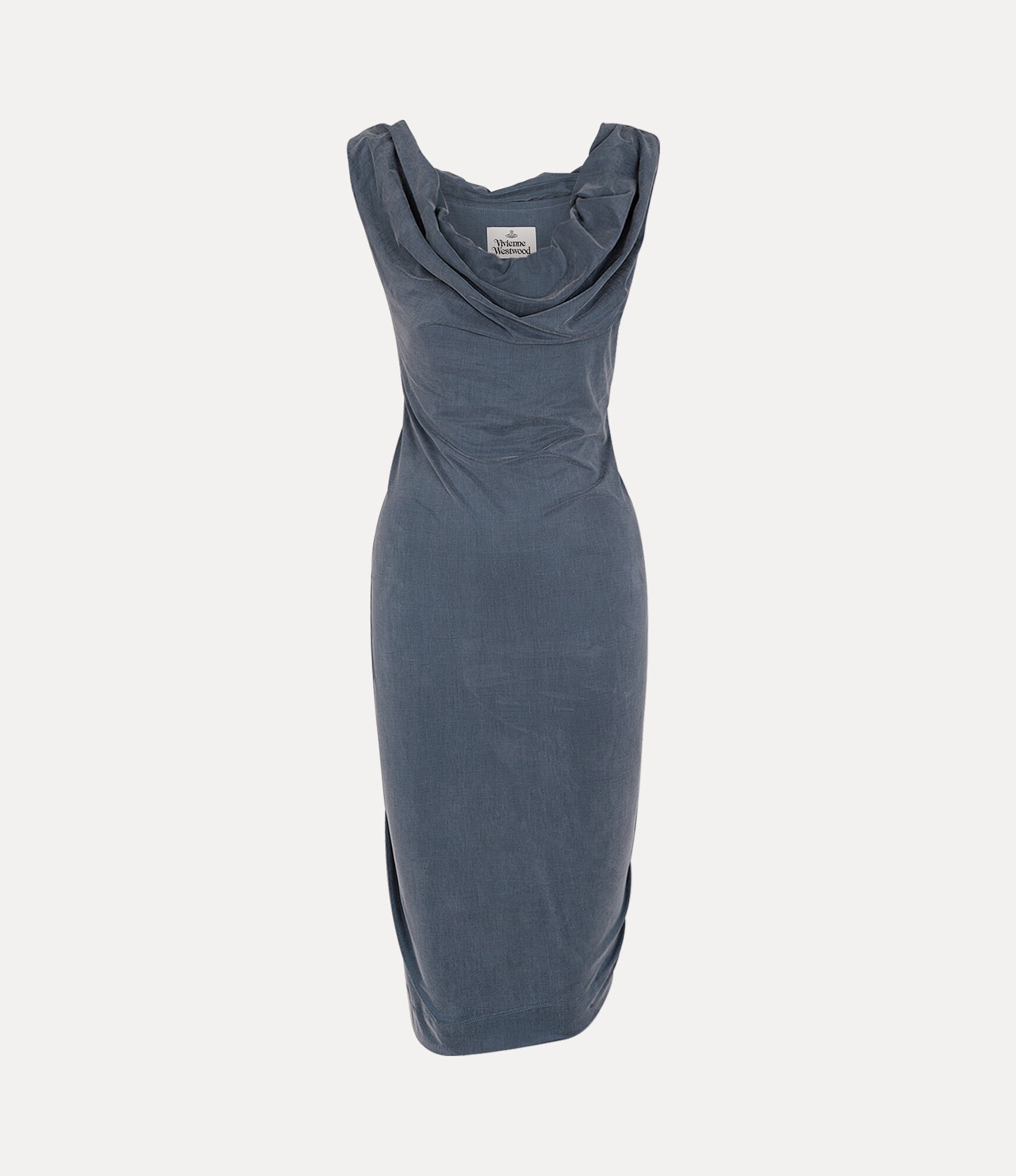 The Ginnie Mini Jersey dress features an all-over ruching detail at the cowl neckline, allowing it to be styled as a one-shoulder design. The piece is adorned with a dusty blue fabric that evokes a sense of nostalgia, a recurring theme throughout this season's collection, complete with cinching at the waist and an asymmetric, mini-length silhouette. Code: 11020008-J008E--NAVY - Features a slim fit - Slight stretch - Sleeveless silhouette - Gathering at the side - Asymmetric split hem - Woven label at the neckline - Made in Italy COMPOSITION - 94% Cupro - 6% Elastane