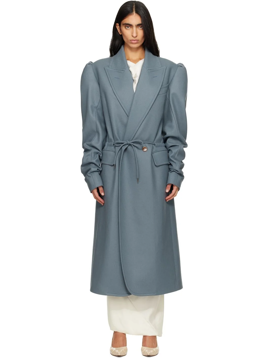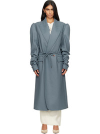Virgin wool-blend melton coat. · Peaked lapel · Double-breasted button closure · Drawstring at waist · Flap pockets at front · Padded shoulders · Surgeon's cuffs · Central vent at back hem · Welt pocket at interior · Full satin lining Supplier color: Teal Body: 95% virgin wool, 5% cashmere. Lining: 100% viscose. Made in Italy 252314F059003