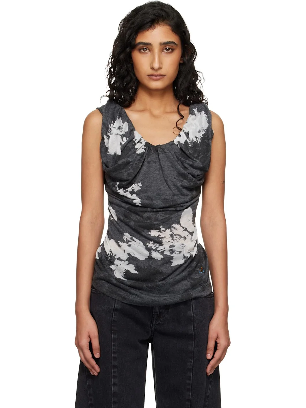 Viscose-blend jersey top. · Jacquard floral pattern and gathering throughout · Draped construction · Cowl neck Supplier color: Grey/Flowers 60% polyester, 40% viscose. Made in Italy 261314F111025