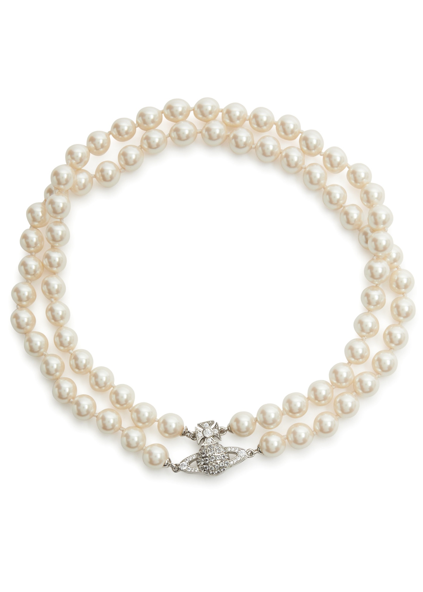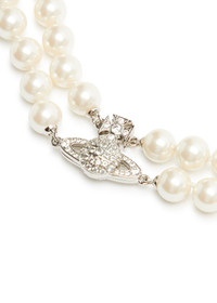 INFO & CARE - Vivienne Westwood glass pearl necklace - Double-layered design, signature orb pendant, pavé crystal embellishments - Magnetic clasp fastening - Presented in a designer-stamped box - Gift boxes are subject to availability SIZE & FIT - Length: 31.5cm - Pendant dimensions: 2cm x 1.5cm