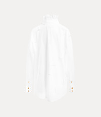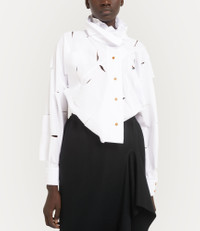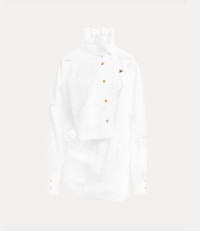 Inspired by Tudor portraiture, our Halston blouse offers a high-stand ruffled collar, secured with a double-button fastening. Soft, sculptural draping falls elegantly across the body, while intricate slash detailing adorns the design - a signature element first introduced in the Vivienne Westwood Spring–Summer 1991 collection, 'Cut, Slash and Pull'. Code: 1501006E-W018T--WHITE - Features structured shoulders - Asymmetric front closure - Back yoke with pleats - Buttoned cuffs - Extended angular hemline - Engraved amber buttons - Model is 5'11/180cm and is wearing a size 40 - Made in Italy COMPOSITION - 100% Cotton