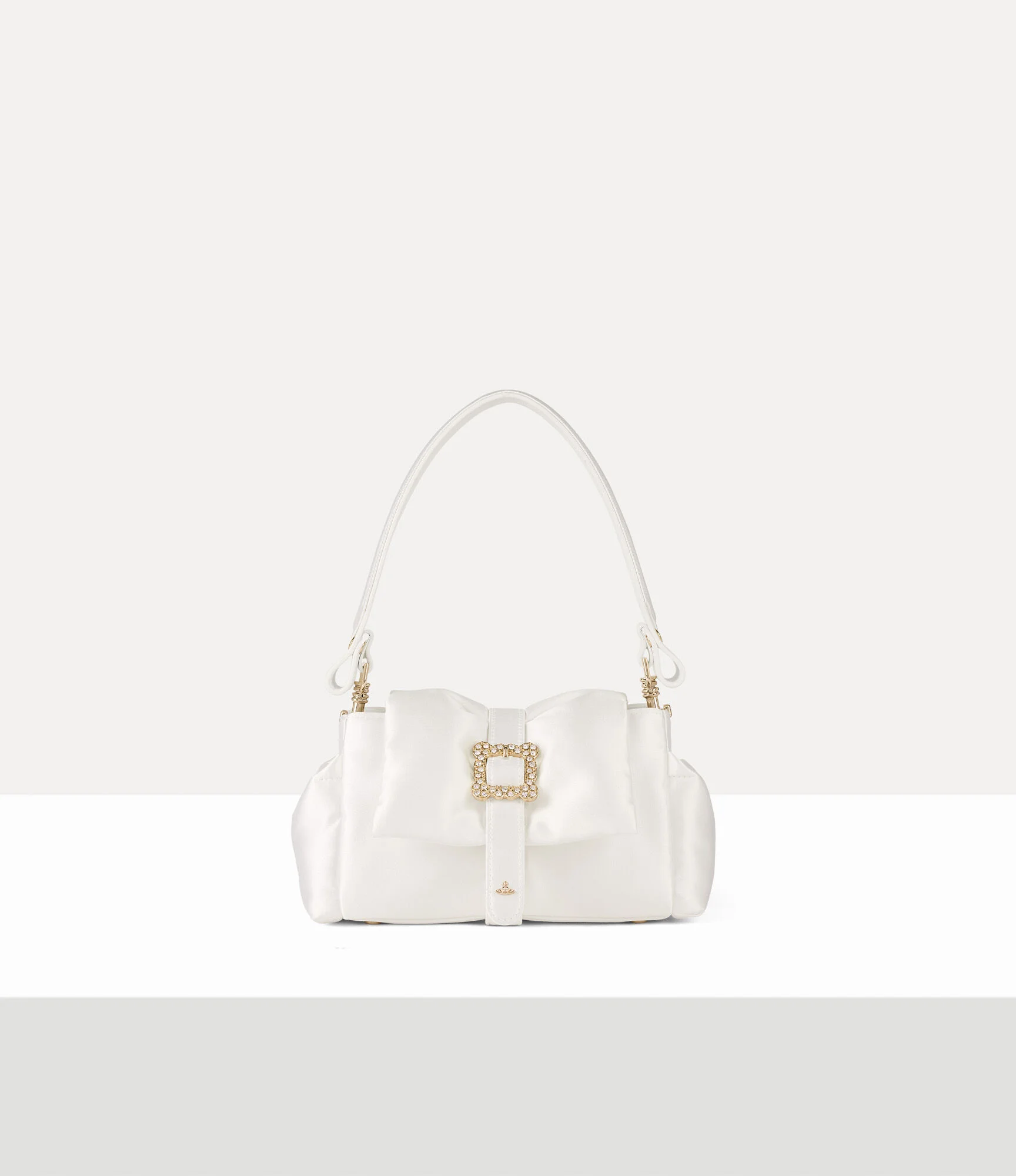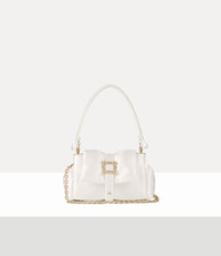 Our Hazel Mini Treasure handbag is crafted from a silk blend and features a top-handle design, complete with our signature pastel-blue lining and polished hardware details. A sculptural belt strap wraps around the soft silhouette, adorned with a decorative orb charm and finished with an opulent crystal-encrusted frame buckle, recalling Vivienne’s reverence for art history. Code: 8053195399680 - Features a crystal-embellished buckle - Top-handle silhouette - Removable chain strap - Small polished orb on the front closure - Magnet snap fastening - Signature pastel-blue lining - Gold-tone hardware - Embossed internal tab - Tonal stitching COMPOSITION - 68% Viscose - 32% Silk