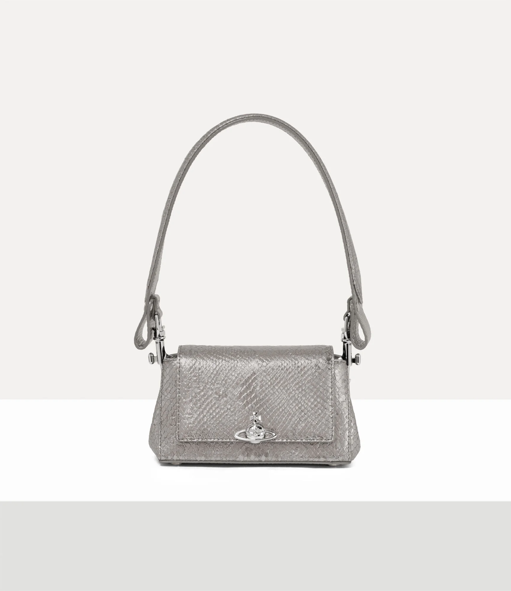 Our signature Hazel Small handbag is reimagined this season in metallic python-effect embossed leather. The piece offers our polished bas relief orb motif on the magnetic clasp fastening, synonymous with Vivienne's vision of launching tradition into the future. Code: 8053195383467 - Features a removable chain strap - Front flap closure - Python-effect embossed finish - Tonal stitching - Base feet - Polished metal hardware - Top-handle silhouette - Length 19cm, height 11cm, depth 8.5cm COMPOSITION - Main material: 100% calf leather - Lining: 100% cotton - Hardware: plated brass