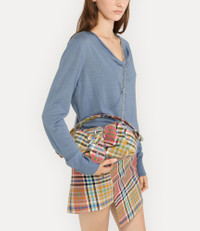 Our Hazel Treasure handbag is reimagined in this season's vibrant woollen ‘Heather Check’ motif, detailed with the house’s archival ‘punk pockets’ at either side of the design. Crafted with a sculptural belt strap that wraps around the softly structured silhouette, the piece is finished with our bas relief orb emblem at the front. Code: 8053195383498 - Features a compact, sculptural shape - Gathered fabric detailing - Short shoulder strap - Polished eyelets - Belt detail - Bas relief orb motif - Foil-embossed branding - Length 26cm, height 15cm, depth 12.5cm - Made in Italy COMPOSITION - Main material: 100% virgin wool - Lining: 70% recycled cotton, 30% cotton