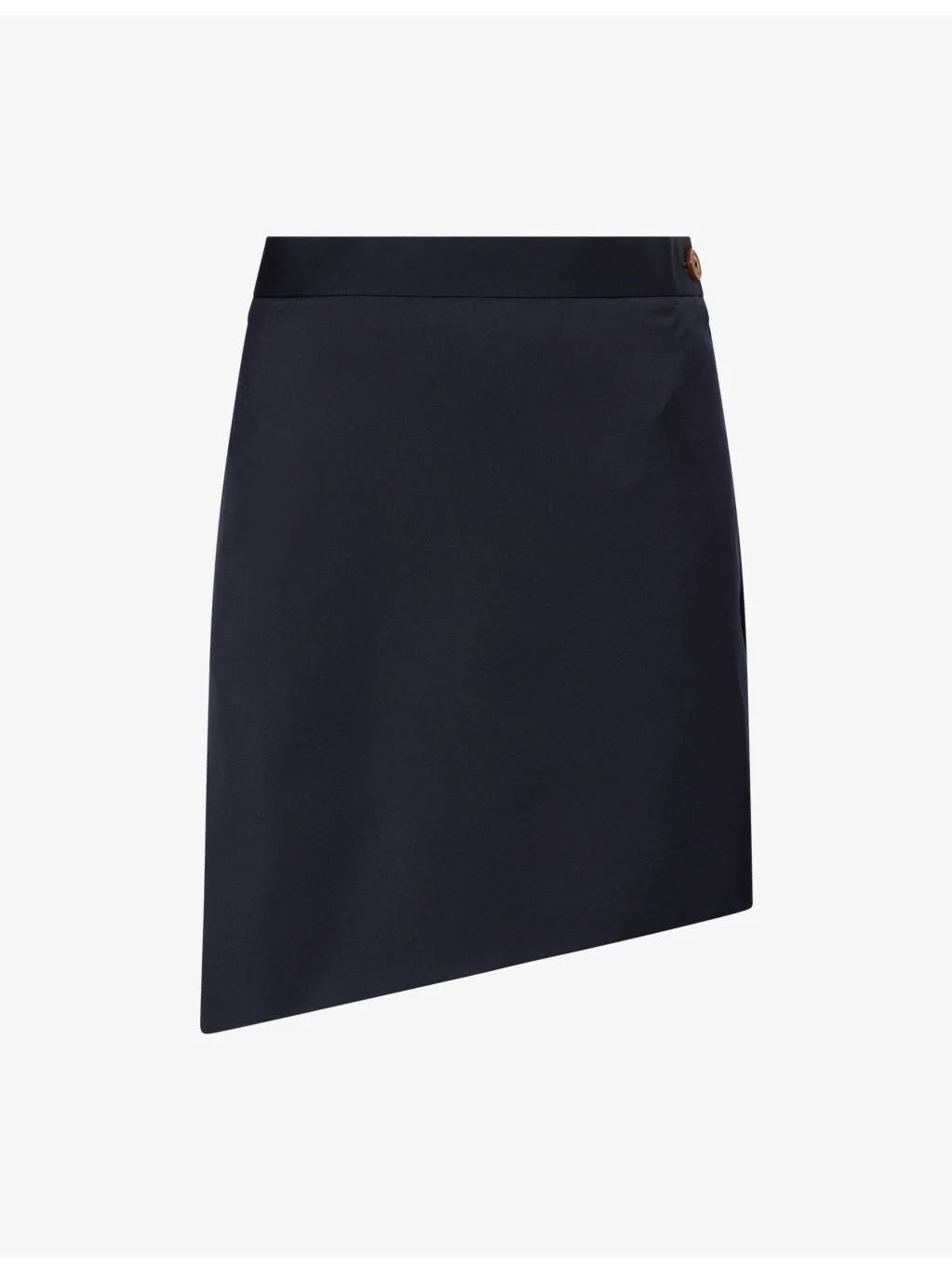 PRODUCT DETAILS - Vivienne Westwood wool mini skirt - 100% virgin wool; lining 100% viscose - Exposed button and concealed zip fastening at back - Regula fit, mid-waist, darts at front and back, fully lined, asymmetric hem - Dry clean - Made in Italy - True to size - Size UK 8: length 19in / 49cm - Model is 5ft 10in/1.78m and wears a size UK 8 - Lightweight, stretchy Ref: R04466602