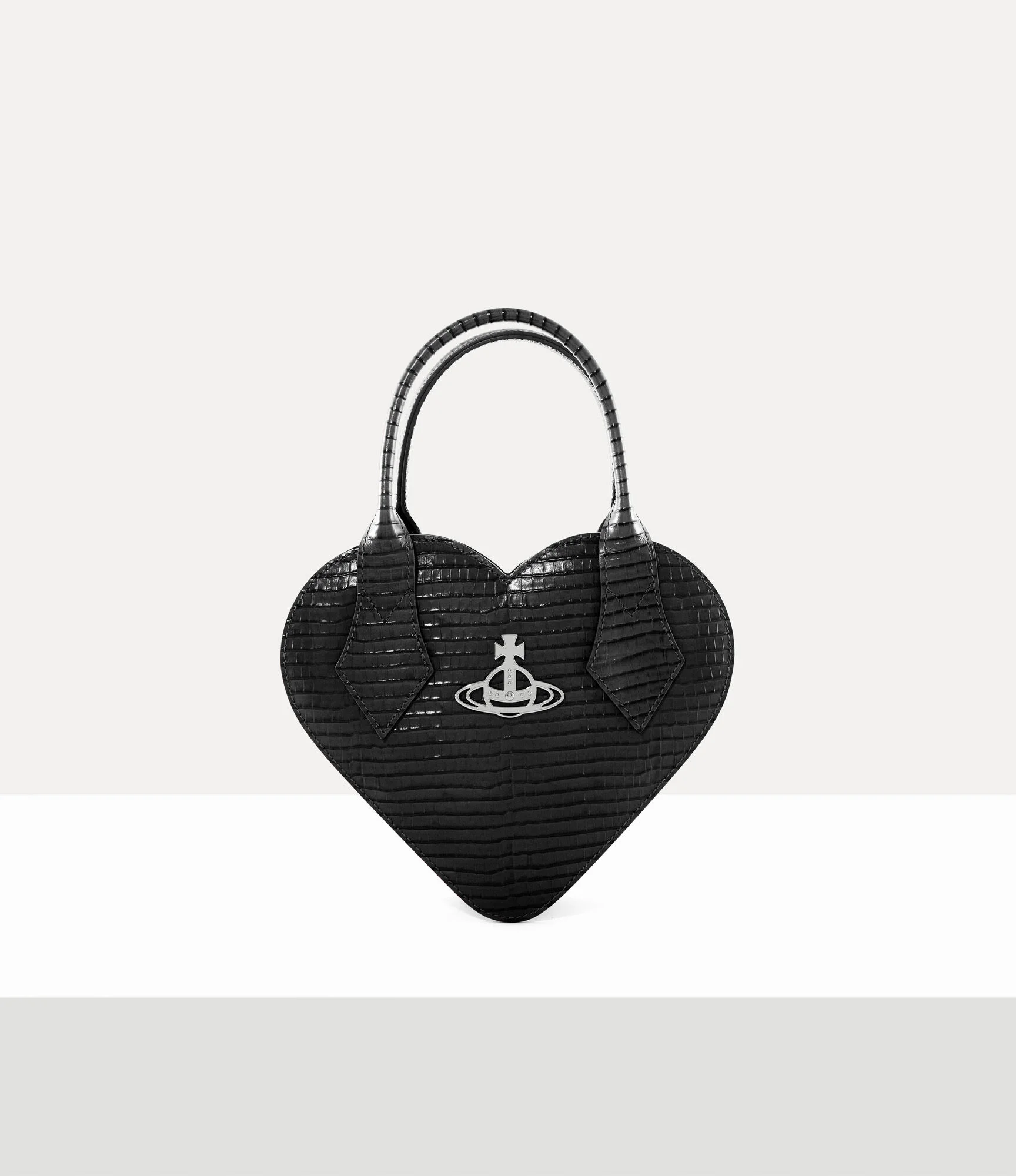 Our Josephine Heart Crossbody bag reimagines the house's signature heart-shaped motif, recalling Vivienne's affection for humanity and the planet. Crafted from croc-effect embossed leather, the bag features a sleek single-compartment design with a zip-around fastening, adorned with our iconic orb motif. Code: 8053195232277 - Features a top handle silhouette - 'Mini' croc-effect embossing - Internal pocket - Moire lining - Tonal stitching - Removable strap - Zip-around fastening - Polished hardware - Height 20cm, width 23cm, depth 7.5cm - Made in Italy COMPOSITION - Main material: 100% calf leather - Interior lining: 100% viscose