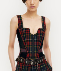 The Juliet corset is characterised by a sculpted bodice and features woollen silhouette, complete with this season's bold 'Scarlet' tartan across the design. The piece receives internal boning for a structured shape, adopting mesh panels at the sides for a comfortable fit. Code: 1503004D-W0176--RED-GREEN - Features a back-zip fastening - Sculpted bodice silhouette - 'Scarlet' tartan - Flat front - Winged neckline - Internal boning - Orb monogram puller - Structural design - Comfortable and supportive fit COMPOSITION - 100% wool