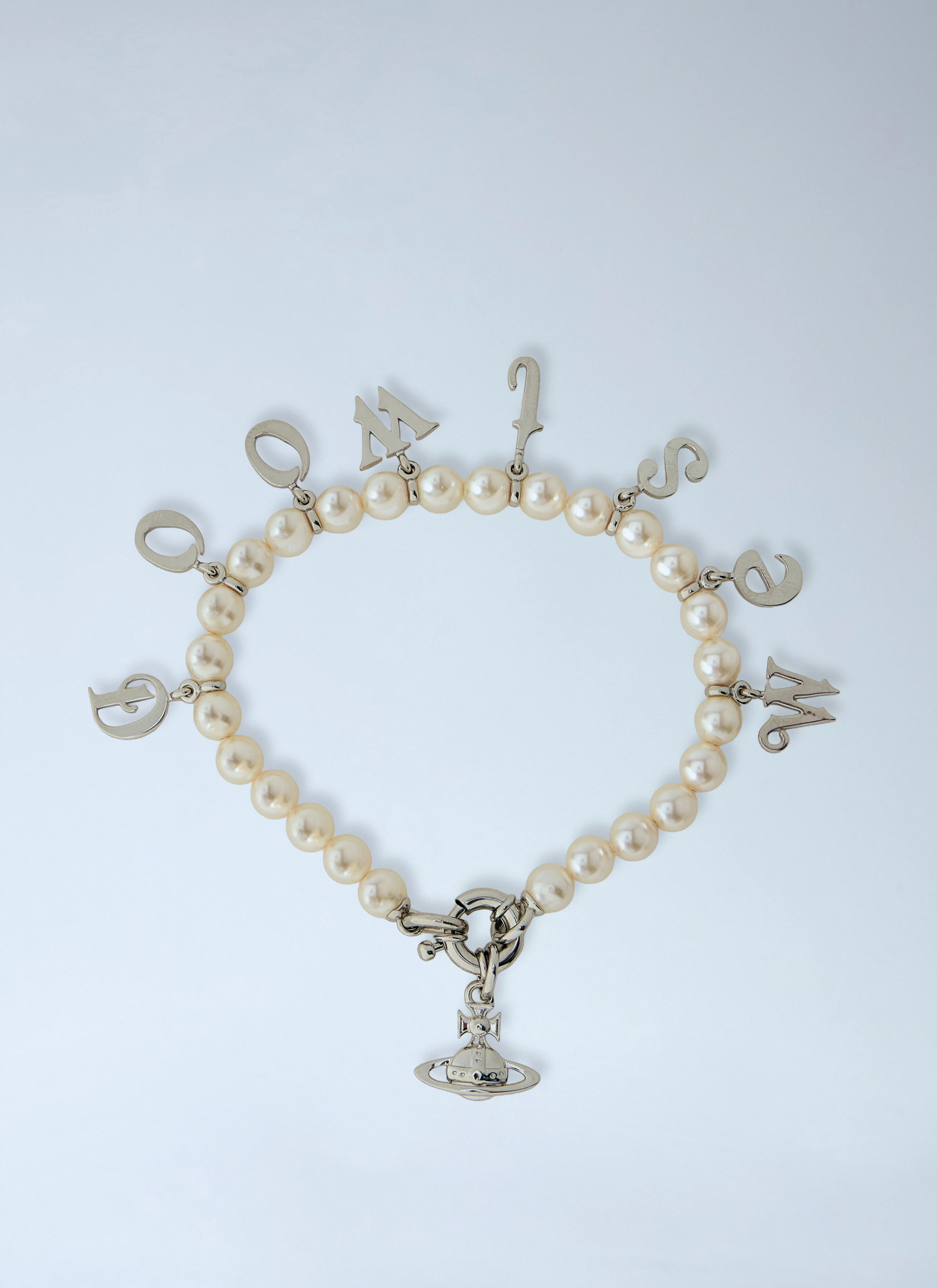 Bracelet with letter charms and pearl beads. - Letter charms - Pearl bead construction - Lobster clasp fastening - 100% Brass - Color: Silver - Code: 6102026I-02P752-P752