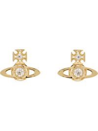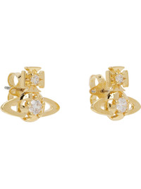 Pair of stud earrings in gold-tone brass. · Logo and cubic zirconia stones at face · Post-stud fastening · H0.5" x W0.75" Supplier color: Gold/White cz Brass, cubic zirconia. Made in Thailand 252314F022030