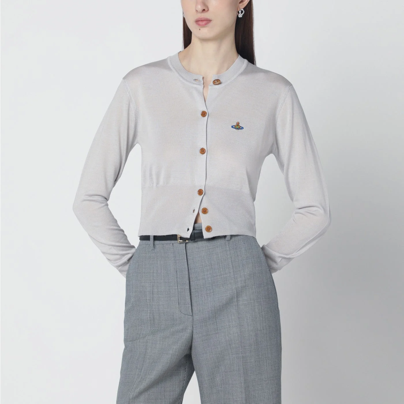 Cropped round-neck cardigan by Vivienne Westwood in light grey wool and silk• Long sleeves• Front button closure• Ribbed trims• Multicolor embroidered Orb logo on the chest