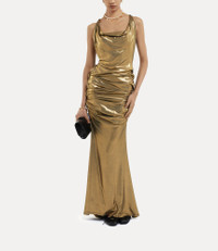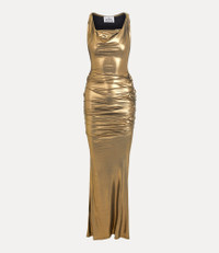 The Liz Jersey Dress is crafted from our statement "Disco" jersey, with gold thread capturing the opulence of this season's Neo-Classical theme. Featuring draping details that gracefully hug the body for a sleek finish, the design pays tribute to Vivienne Westwood's renowned tailoring techniques. Code: 1102001A-J007P--GOLD - Sleeveless silhouette - Cowl neckline - Slip-on design - Shoulder straps - Floor length - Tonal stitching - Embellished - Orb motif on back pocke - Model is 5'11/180cm and is wearing size S COMPOSITION - 95% Viscose - 5% Elastane