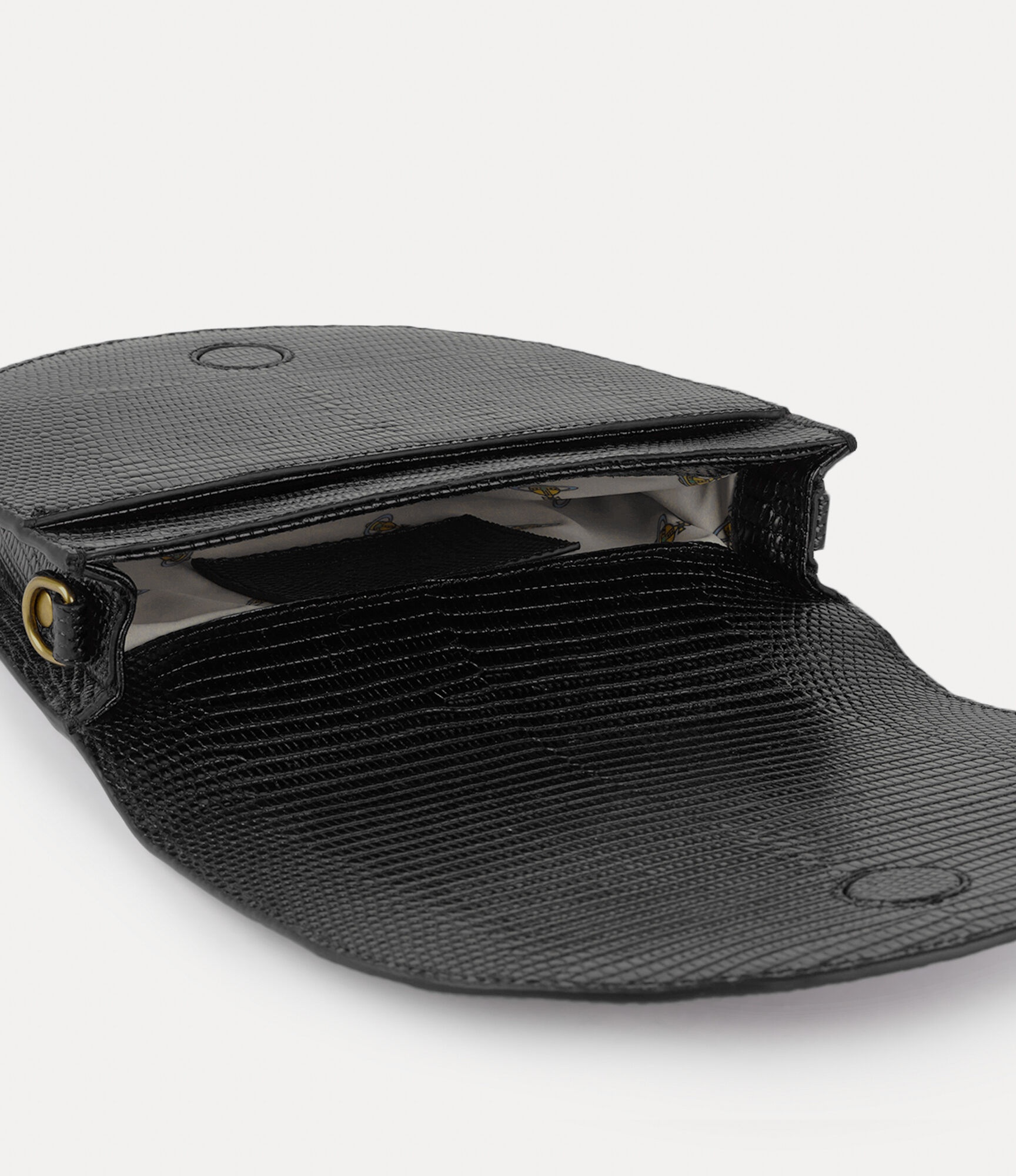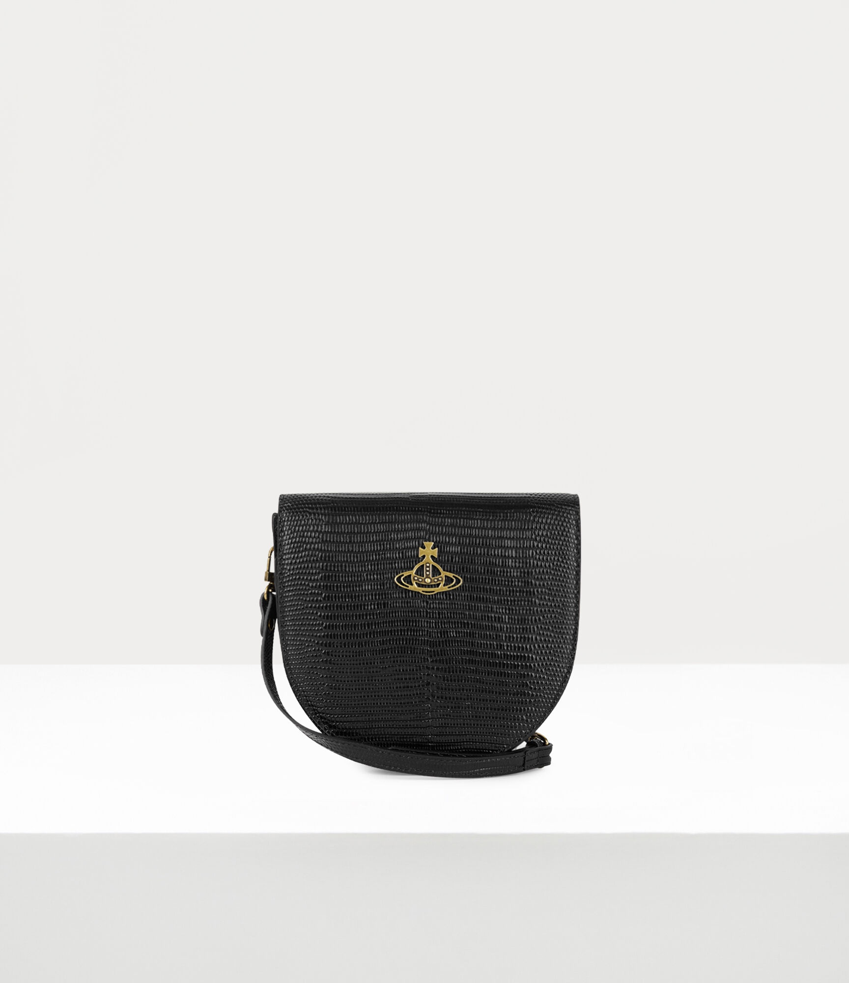 Defined by its semi-circle shape, the lizard-embossed Lizard Saddle Crossbody bag opens to a roomy compartment that's lined with our 'Baby orb' artwork and to finish, it features line orb plaque on the front panel. Code: 8050889588528 - Magnetic stud fastening - Lizard-embossed texture - Orb plaque at front flap - Interior card slot - Single compartment - Tonal stitching - Baby Orb lining - Measurements: height 16cm, width 20cm, depth 10cm - Adjustable strap measures 144cm - Made in Italy COMPOSITION - 100% Calf leather - Interior lining: 68% recycled cotton, 32% cotton - The leather used has been awarded against the LWG Environmental Auditing standards designed to provide a measure of compliance and performance capabilities of the leather business.