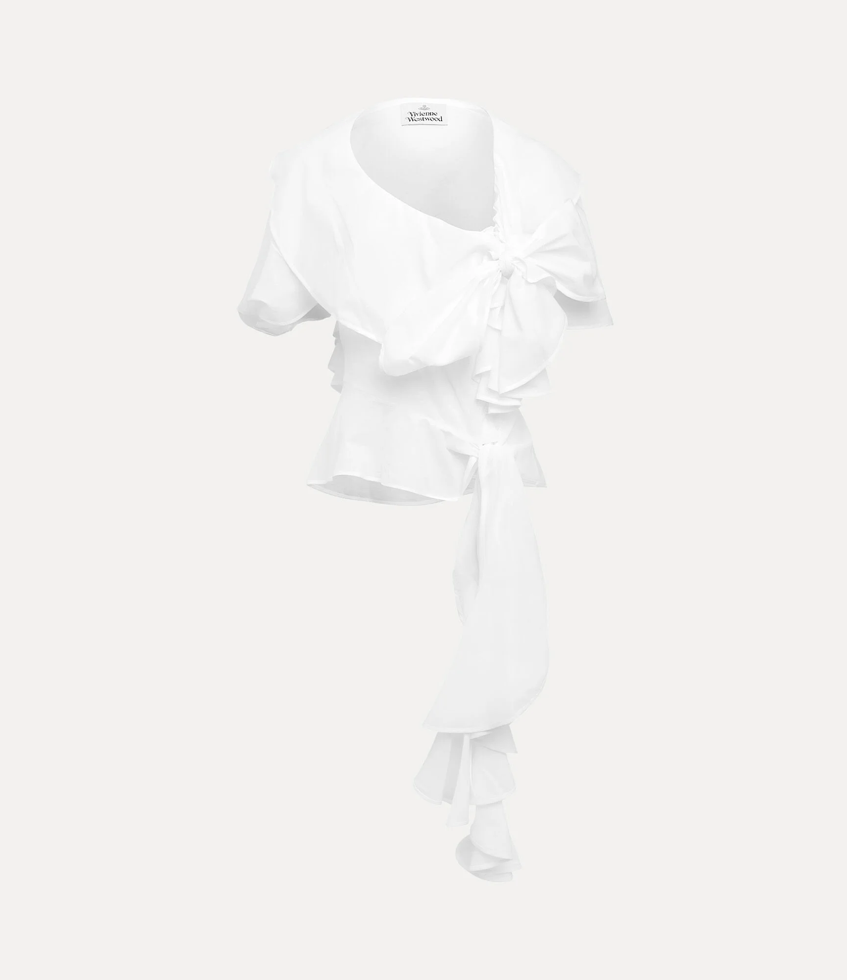 Our Lola Ruffle top drapes across the body with deliberate asymmetry to create a voluminous silhouette, finished with the house’s signature bow motifs, cascading into sweeping ruffle details. Cinching at the waist, the piece is framed by a romantic neckline and softly puffed sleeves. Code: 15050013-W0187--WHITE - Features an asymmetric neckline - Oversized bow detail - Draped ruffle extension - Short, slightly puffed sleeves - Cinched waist - Peplum hem - Sculptural - Ruching detailing - Model is 5'9/177cm and is wearing a size 40 - Made in Italy COMPOSITION - 100% Organic cotton - The fabric is piece-dyed and has a semi-sheer finish - Organic fibres are natural fibres grown with strict rules concerning the use of synthetic pesticides, insecticides, or herbicides and GMOs (Genetic Modified Organisms).