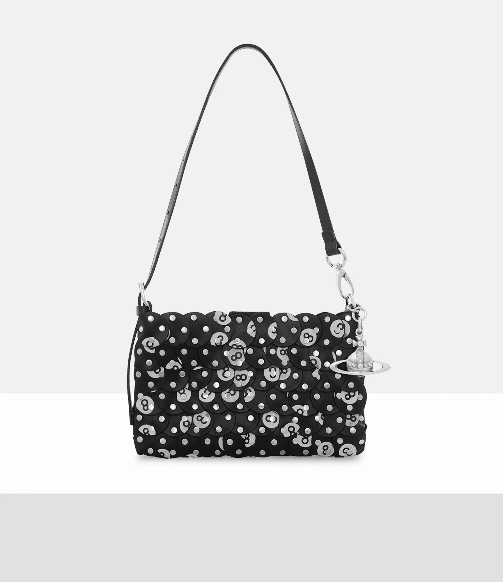 The Lola shoulder bag, created in partnership with the Ethical Fashion Initiative for our Made in Kenya collection, draws inspiration from vintage bingo and billiard prints. The silhouette is crafted from hand-cut leather circles, adorned with hand-applied silver-tone ‘8 Ball’ studs. Code: 8053195303434 - Features an open compartment - Slim silhouette - Dangling orb charm - Silver-tone hardware - Unlined interior - Softly curved edges - Adjustable strap - Compact size - Fits smartphone and essentials - Made in Kenya COMPOSITION - Main material: 100% cow leather - Hand-embossed inner label