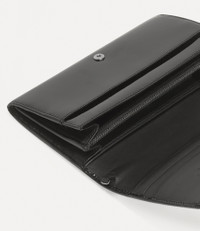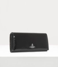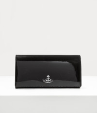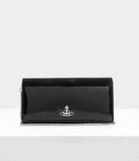 Our Long wallet features a silver-tone chain strap, complete with interior card slots and a zipped coin compartment. The patent finish takes inspiration from the liquid latex and rubberwear sold in our iconic Sex boutique, while the orb on the front panel is synonymous with Vivienne's vision of taking tradition into the future. Code: 8050889914686 - Press-stud fastening - Fourteen card slots - Note slots - Internal zip fastening - Coin compartment - Line orb stud - Measurements: height 11cm, width 19cm, depth 4cm - Removable chain measures 54.5cm COMPOSITION - 100% Leather