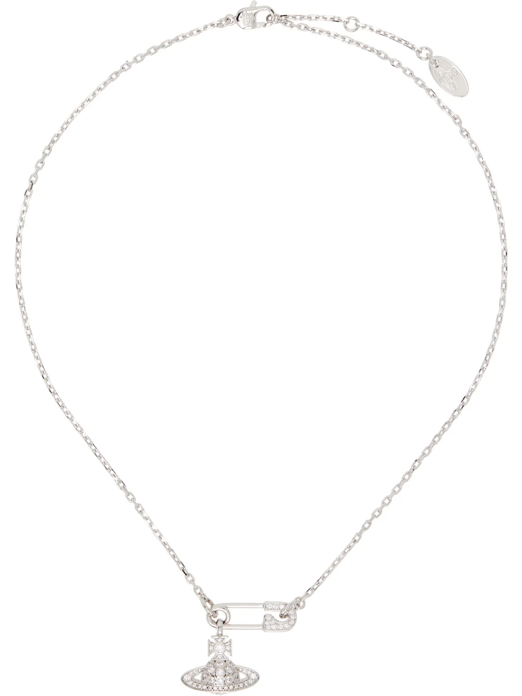 Cable chain necklace in silver-tone brass. · Logo graphic pendant with pave-set stones · Logo plaque at adjustable lobster-clasp fastening · L17.5" Supplier color: Platinum/White CZ Brass, cubic zirconia. Made in Thailand 252314F023028