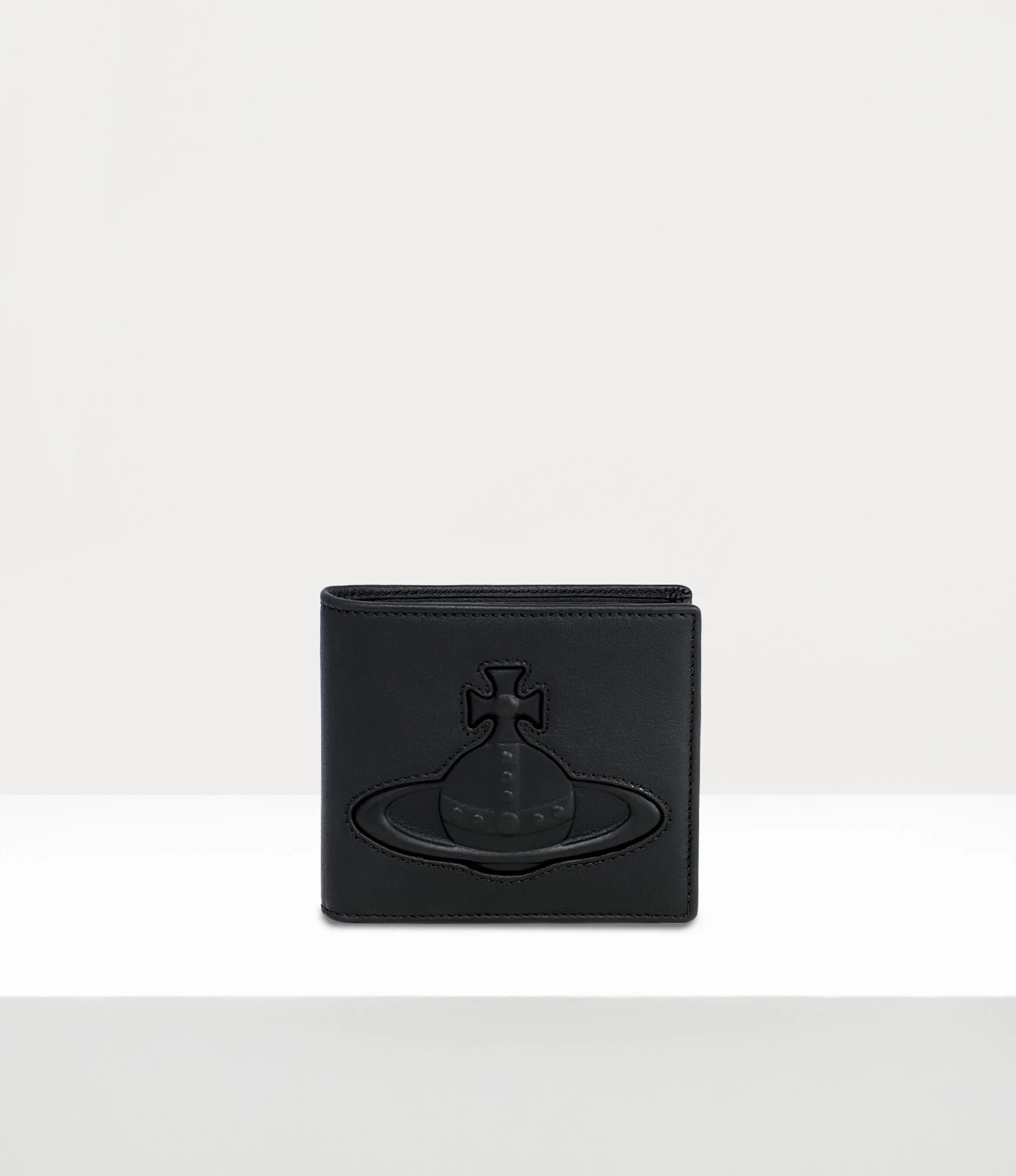 Our Man Billfold wallet in leather showcases a smooth surface with the phrase 'Vivienne Westwood' inscribed on the interior panel. The piece receives a three-dimensional injected orb motif on the front panel - recalling Vivienne's vision of launching tradition into the future. Code: 8050889915010 - Bi-fold design - Tonal stitching - Internal note slots - Measurements: height 8cm, width 11.5cm, depth 1cm COMPOSITION - 100% Leather