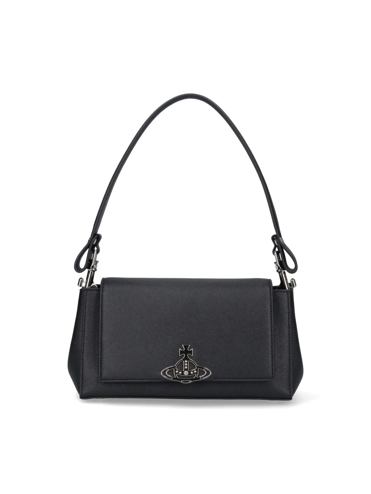 "HAZEL" MEDIUM SHOULDER BAG IN BLACK FABRIC WITH HAMMERED PATTERN, HANDLE, REMOVABLE ENAMELED METAL SHOULDER STRAP, MAGNETIC BUTTON FLAP CLOSURE, SILVER METAL "ORB" LOGO DETAIL, THREE INTERIOR CARD SLOTS, REMOVABLE INTERIOR MIRROR, MAIN INNER COMPARTMENT. PRODUCT INFO PRODUCT CODE 46020001W S0021N401 COMPOSITION: 65% POLYURETHANE, 35% COTTON SIZE AND FIT: H 15 X W 26 X D 11.5 CM MADE IN: CHINA