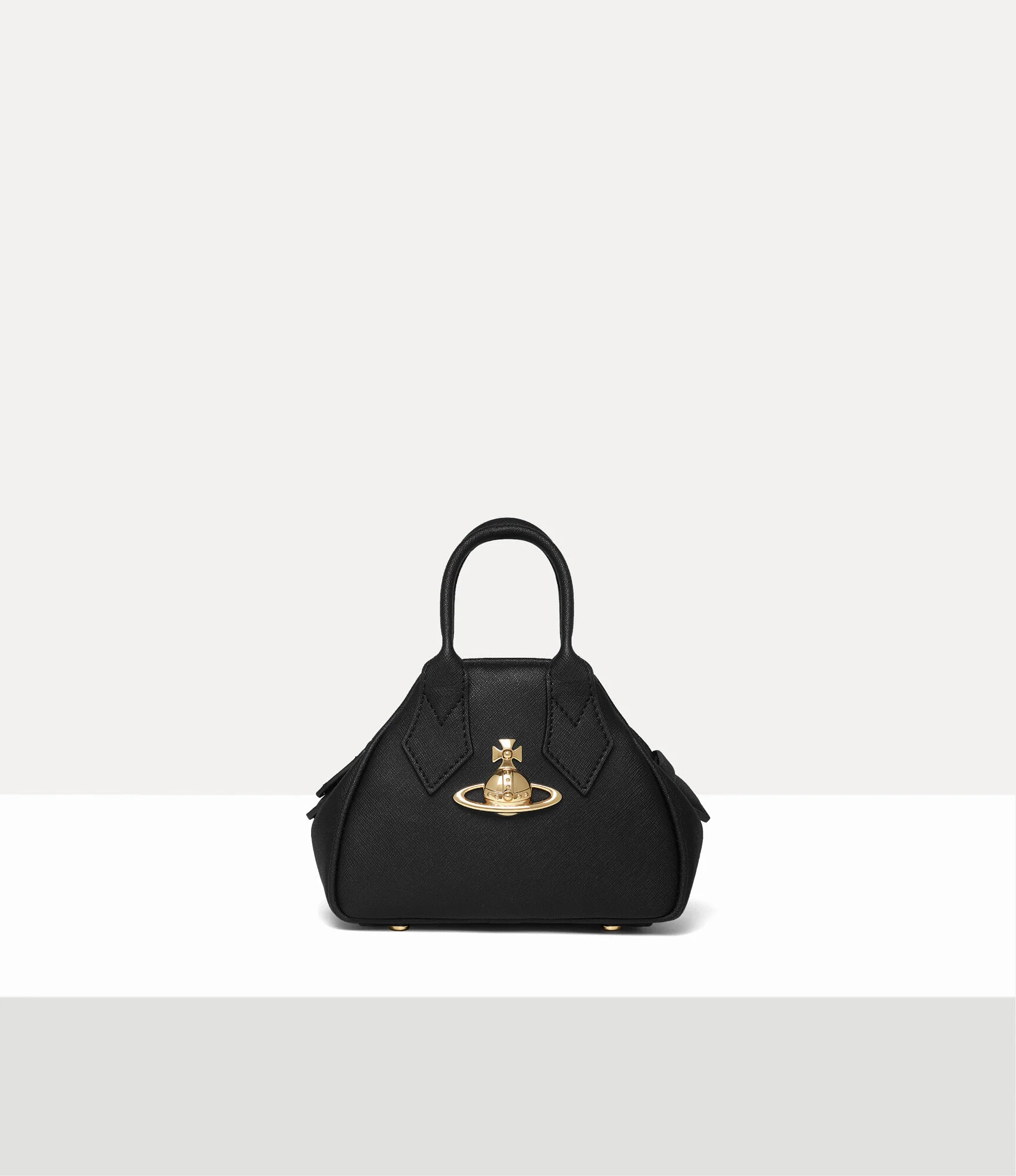 The design of the Mini Yasmine bag pays homage to the Yasmine handbag from the Gold Label Autumn-Winter 1987/88 runway show, titled 'Time Machine'. Named after the French designer Yasmine Eslami, this Vivienne Westwood bag features a scaled-down silhouette in soft PU leather, complete with a raised orb plaque at the front, symbolising tradition and encircled by the celestial rings of Saturn, representing the future. Code: 8050889710806 - Features a saffiano-embossed texture - Top-handle silhouette - Fully lined - Tonal stitching - Top-zip fastening - Gold-tone hardware - Cross-body strap - Base feet - Height 13cm, width 17cm, depth 7cm - Made in Italy COMPOSITION - 16% Polycotton - 30% RePolycotton - 54% Polyurethane