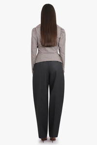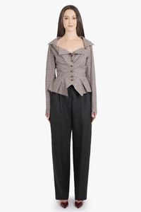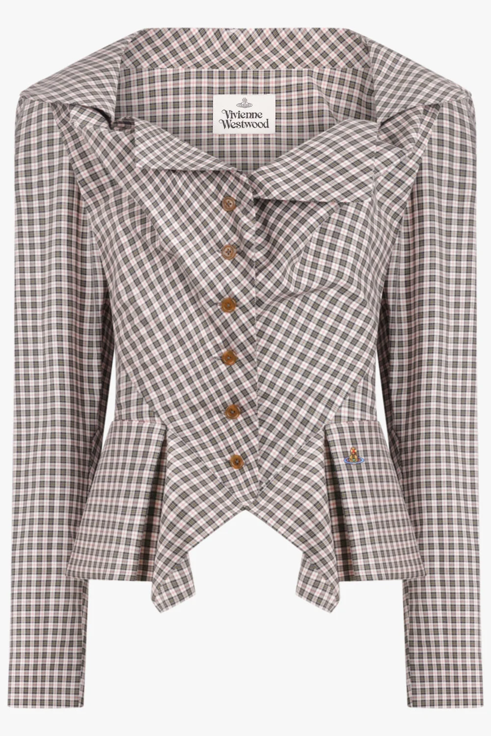 This shirt balances architectural precision with soft detailing, crafted from lightweight 100% organic cotton. Origami-like folds at the neckline meet letter-engraved buttons, while a signature multi-coloured orb embroidery marks the hip with subtle distinction. The fitted bodice flows into a flared, pleated waist extension, complemented by elegantly puffed shoulders. - Fabrication: 100% Organic Cotton - Check Print pattern with contrasting button closure - Long-line silhouette with fitted bodice and flared pleated waist - Low collar with origami-inspired fabric folds - Letter-engraved button fastenings - Multi-coloured orb embroidery at hip - Elegantly puffed shoulders for volume and structure - Darting detail for tailored fit - Lightweight, unlined design - Long sleeves Style with additional Vivienne Westwood Icons to complete the look. Size and Fit Tiah: Model is 178cm/5’9” and is wearing a size IT40 Model Measurements: Bust: 86cm, Waist: 69cm, Hips 90.5cm Fits true to size Measurements 40: Bust 86cm, Waist 72cm, Hip 72cm, Length 58cm 42: Bust 88cm, Waist 74cm, Hip 74cm, Length 58cm 44: Bust 92cm, Waist 78cm, Hip 78cm, Length 58cm 46: Bust 96cm, Waist 82cm, Hip 82cm, Length 58cm 48: Bust 102cm, Waist 88cm, Hip 88cm, Length 58cm