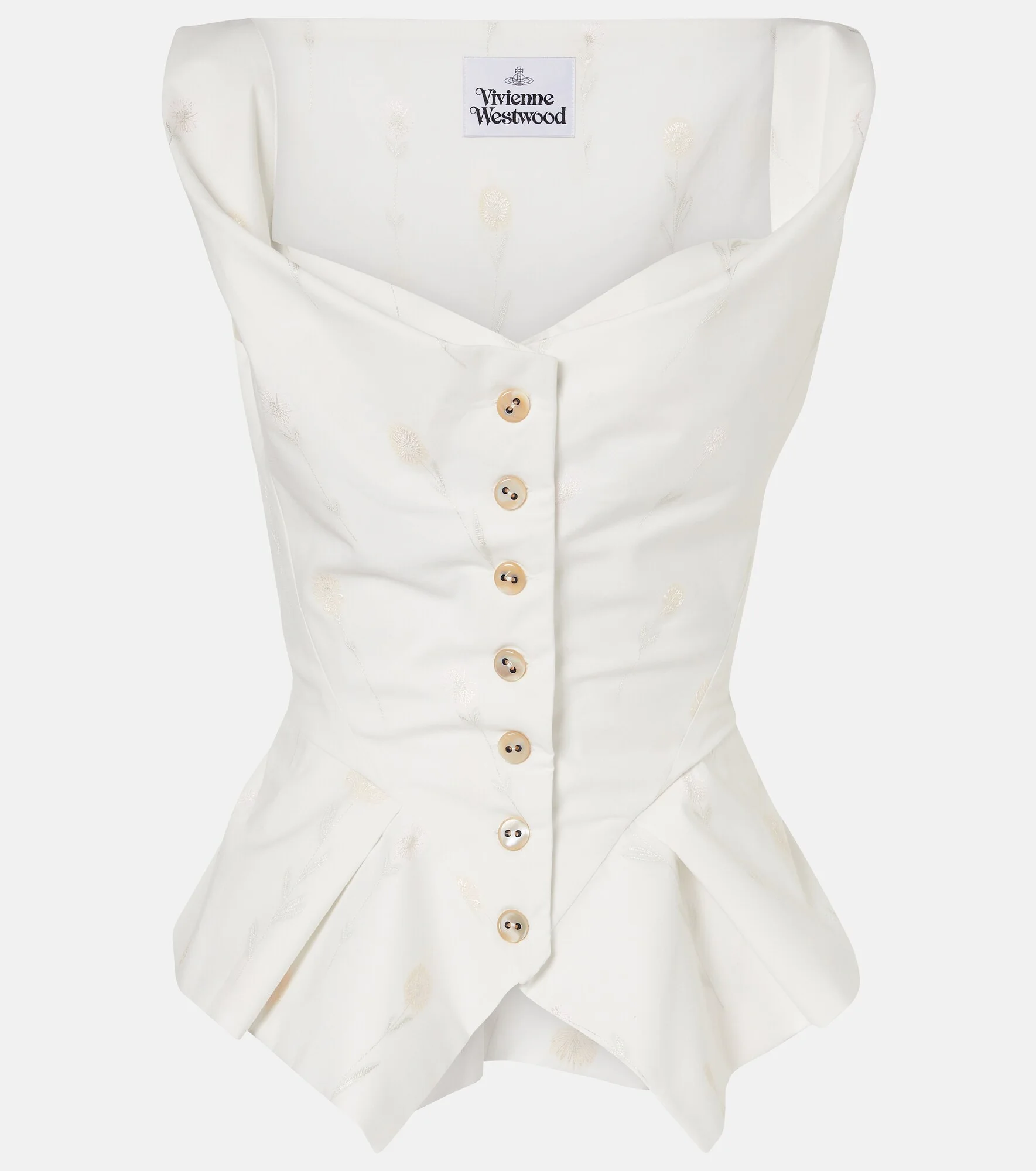 Vivienne Westwood’s designs continue to exemplify the disruptive energy of its late founder – fashion’s original punk pioneer. Cut from a cotton blend and adorned with gracious floral motifs, the Monday vest features sculptural darts at the waist and twisted shoulder straps. Product Details - Material: 93% cotton, 7% viscose - Care instructions: dry clean - Made in Italy - Color: white - Designer color name: White/Flowers - Contains non-textile parts of animal origin - Closure: buttoned front - Item number: P01146837 Size & Fit - Fits large to size - we recommend trying one size smaller - Cinched waist - Non-stretchy fabric - Falls to the hip - The model seen in the picture is 178cm-5'10" and wearing a size IT 38