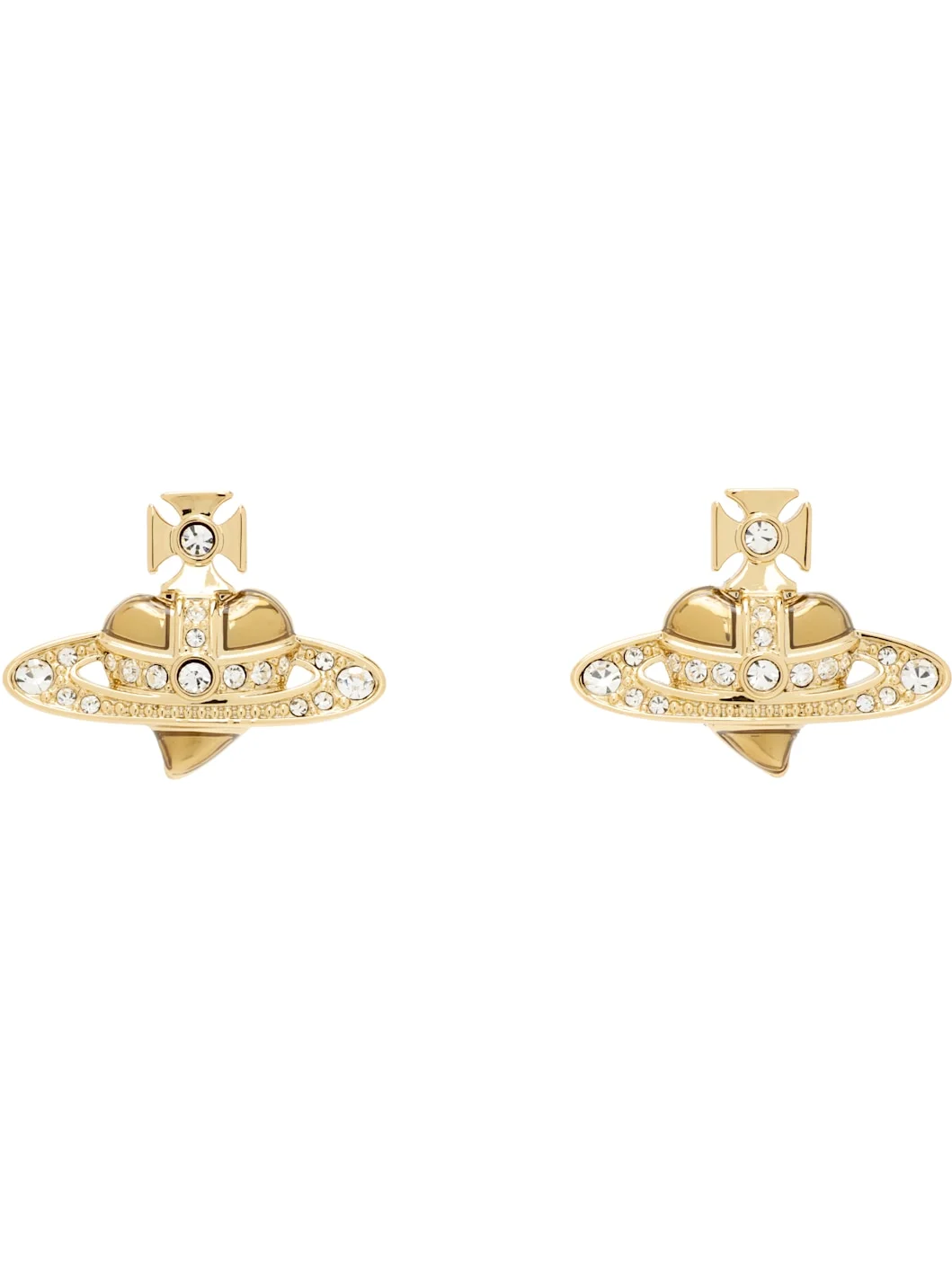 Pair of stud earrings in gold-tone brass. · Enameled logo with pave-set crystals at face · Post-stud fastening · H0.5" x W0.75" Supplier color: Gold/White Crystal Brass. Made in Thailand 261314F022057