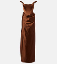 Vivienne Westwood’s designs continue to exemplify the disruptive energy of its late founder – fashion’s original punk pioneer. Made from brown satin, the Nova Camille gown features an off-shoulder neckline, intricate corsetry, and a floor-sweeping silhouette. Product Details - Material: 57% acetate, 37% polyamide, 6% elastane - Care instructions: dry clean - Made in the UK - Designer color name: Brown - Item color: brown - Lining: 95% silk, 5% elastane - Contains non-textile parts of animal origin - Includes: dust bag - Item number: P01048059 Size & Fit - True to size - Internal boned corset for support - Cinched waist - Non-stretchy fabric - The model seen in the picture is 178cm-5'10" and wearing a size UK 8