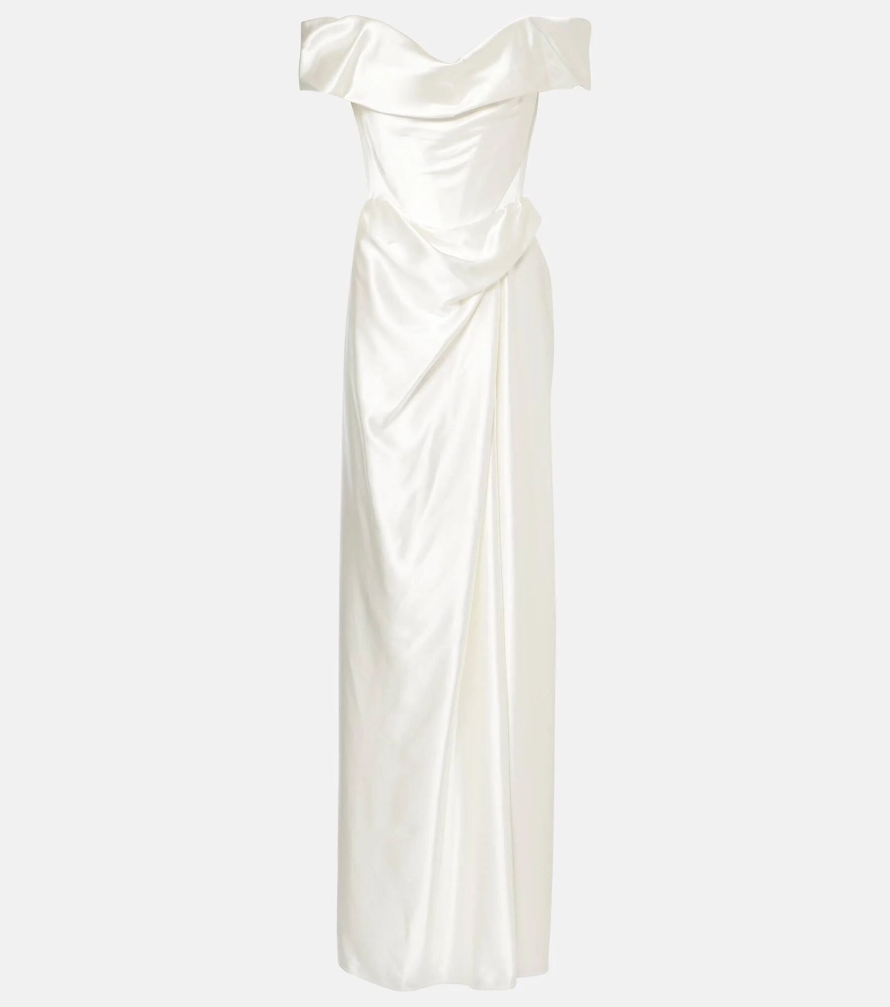 Product Details - Material: 100% silk - Care instructions: dry clean - Made in the UK - Designer color name: Pearl White - Closure: concealed zipper - Lining: 100% silk - Comes with garment bag - Corset - Item number: P01001303 Size & Fit - True to size - Off-the-shoulder - Internal boned corset for support - Cinched waist - Non-stretchy fabric - The model seen in the picture is 178cm-5'10" and wearing a size UK 8