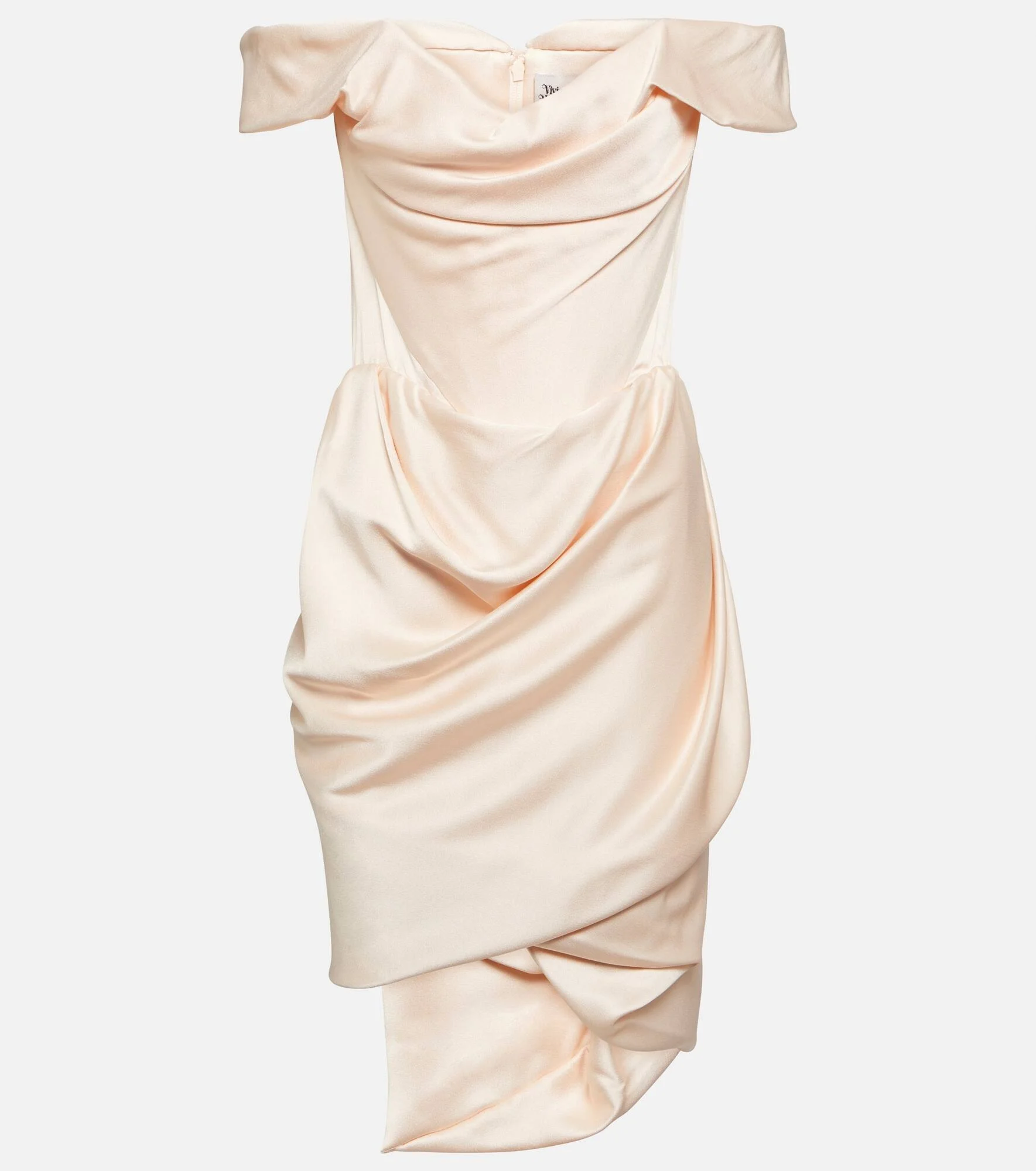 Dress to impress in the Nova Cora minidress from Vivienne Westwood. Made from luxurious, lustrous crêpe satin, it’s shaped with an artful, sculptural drape, a romantic, off-shoulder neckline, and fitted bodice. Product Details - Made in the UK - Material: 27% viscose, 73% acetate - Care instructions: dry clean - Designer color name: Stardust Blush - Item number: P00804065 Size & Fit - True to size - Off-the-shoulder - Internal boned corset for support - Cinched waist - Mid-weight material - The model seen in the picture is 178cm-5'10" and wearing a size UK 8